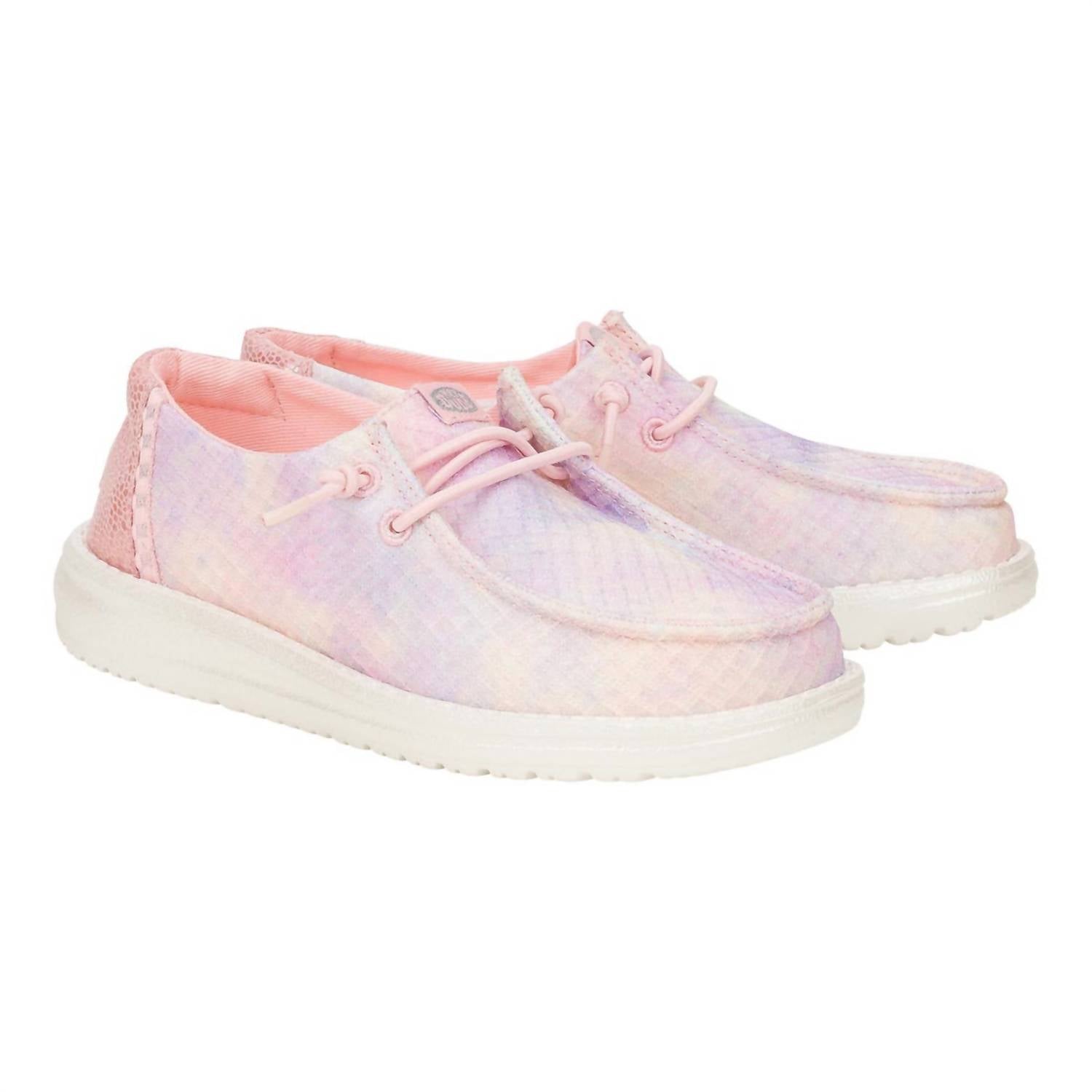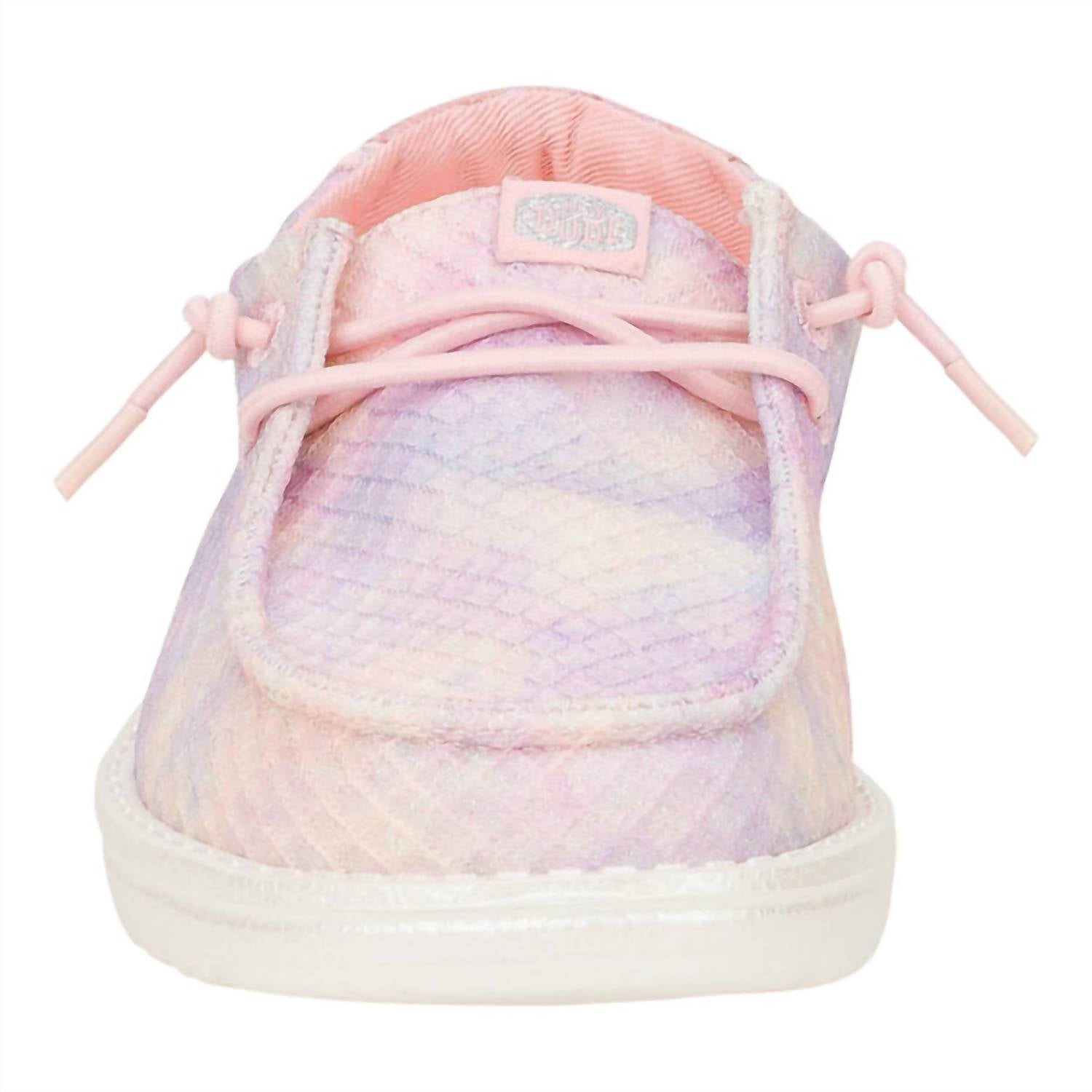 Hey Dude presents the Girl's Wendy Youth Mermaid Shimmer Shoes in an enchanting Coral Pink Multi, perfect for a holiday party or any spring occasion. Designed with a mermaid-inspired iridescent synthetic upper and a pearlized midsole, these sneakers feature a lightweight flexible rubber outsole and a round toe shape. The easy-on system, elastic laces, and a removable foam insole ensure flexible support and comfort. Enjoy the relaxed fit that offers ample roominess for a laid-back, easygoing feel.