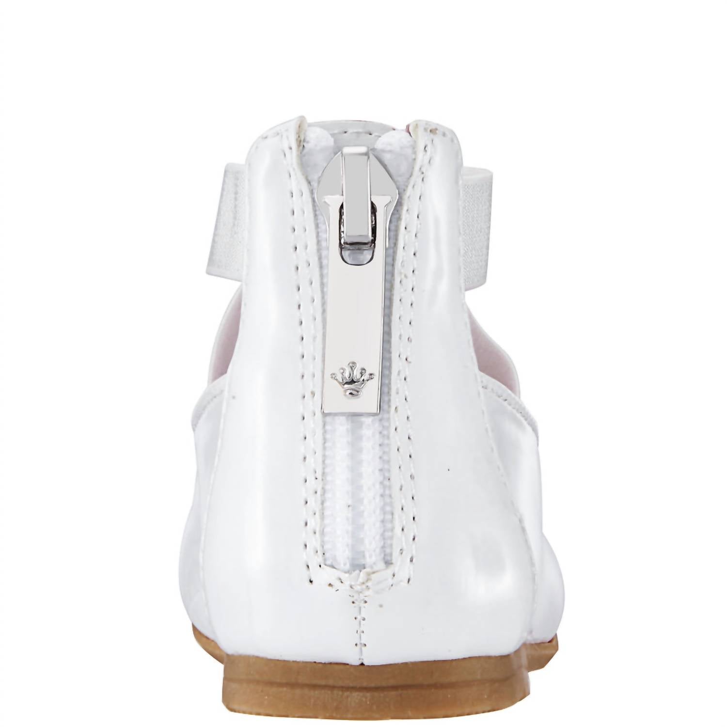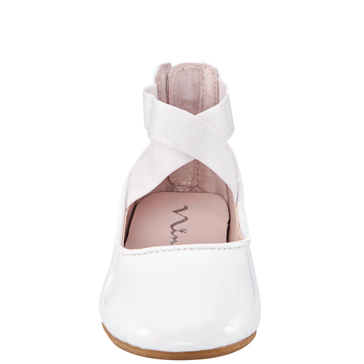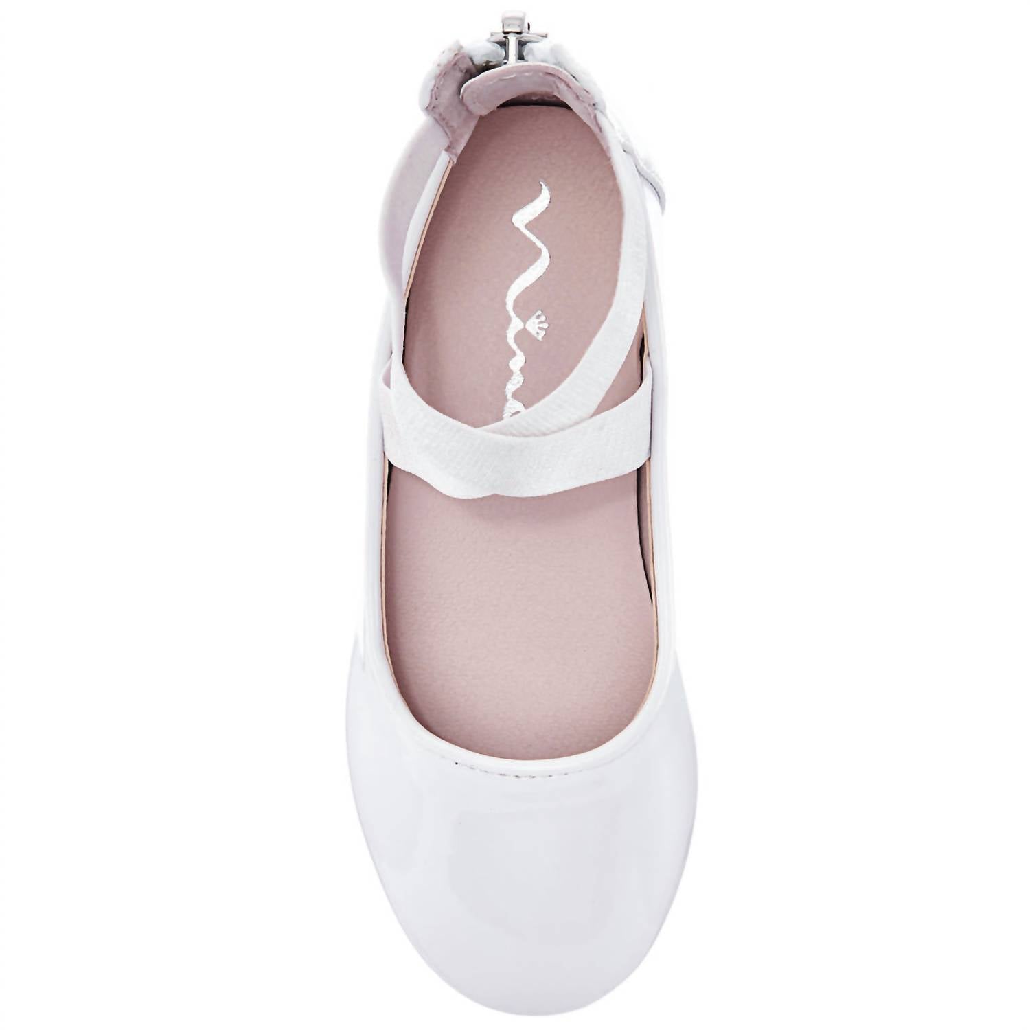 Introducing the Girls' Marissa Ballet Flat Shoe by Nina, a chic choice for holiday parties with its minimalist design in White Patent. These ballet flats feature a man-made upper and lining, promising durability and style. The cushioned memory foam insole provides all-day comfort, while the flexible non-slip TPR outsole ensures stability for active little feet. Designed for little kids with a round toe and flat heel, they are perfect for spring gatherings.