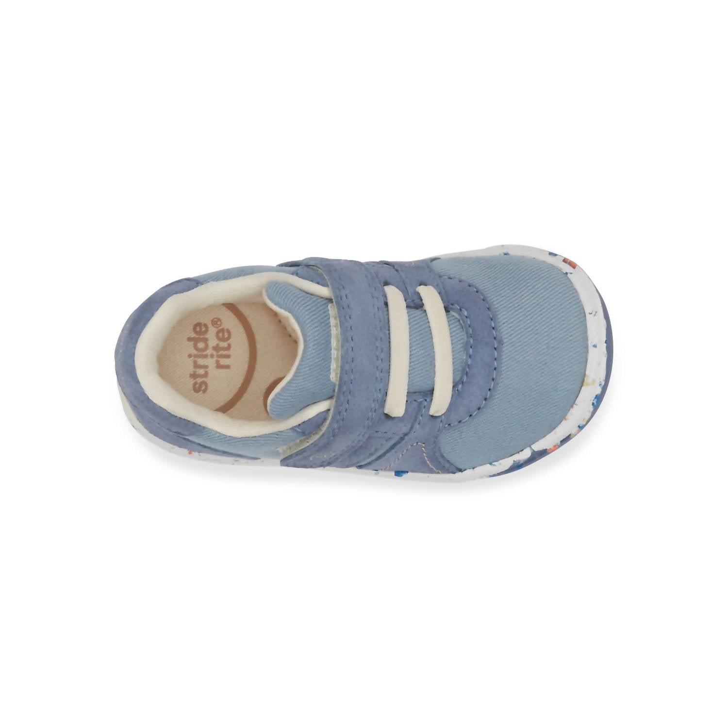 Introducing the Stride Rite Kiids Boys Fern Sneakers, designed for toddlers with mindful materials in a vibrant blue. These sneakers feature a twill upper composed of 30% plant-based fiber and 70% organic cotton, along with chrome-free suede and a recycled twill lining. They offer a comfortable fit with a memory foam footbed and a recycled slip-resistant outsole that includes 10% recycled rubber. The recycled hook-and-loop closure with elastic laces ensures a perfect, adaptable fit, making these sneakers ideal for spring travel adventures.