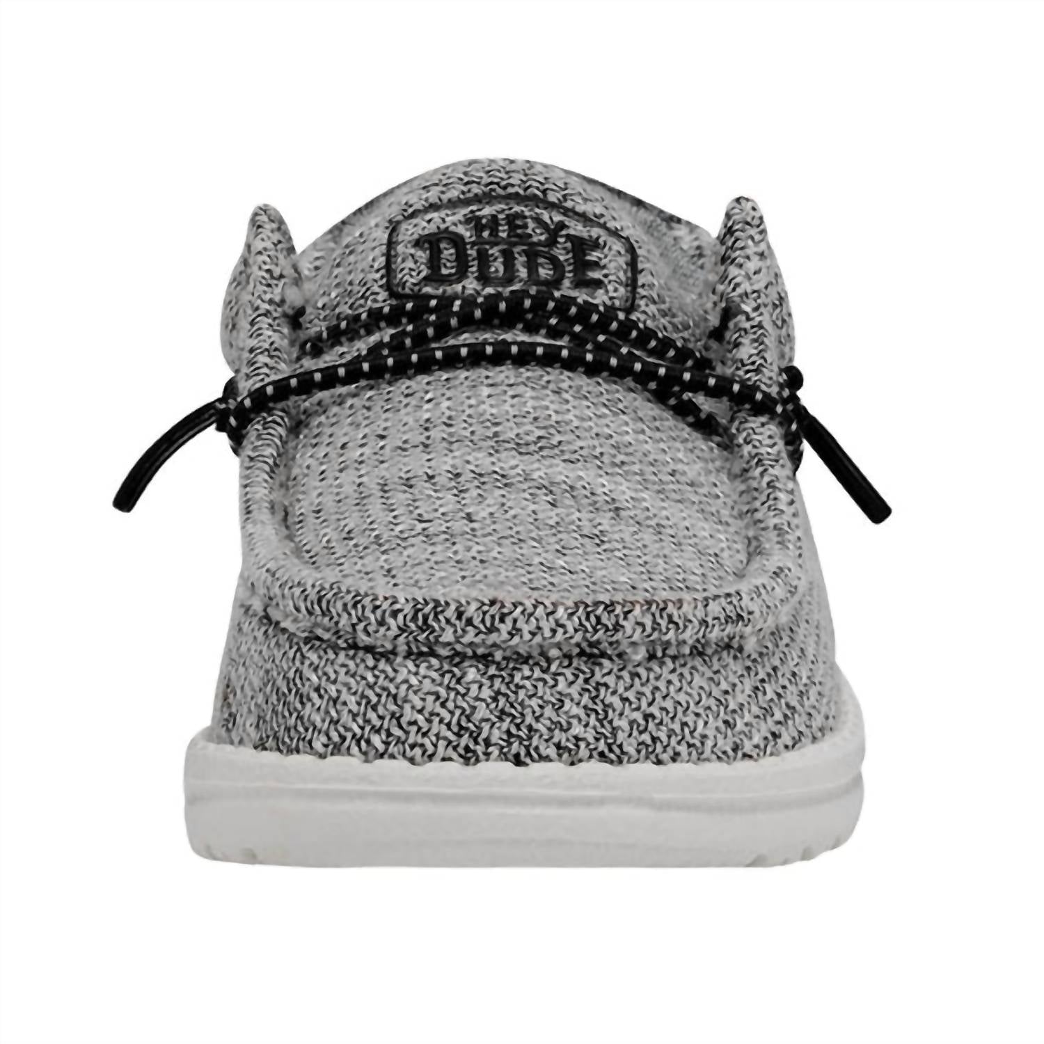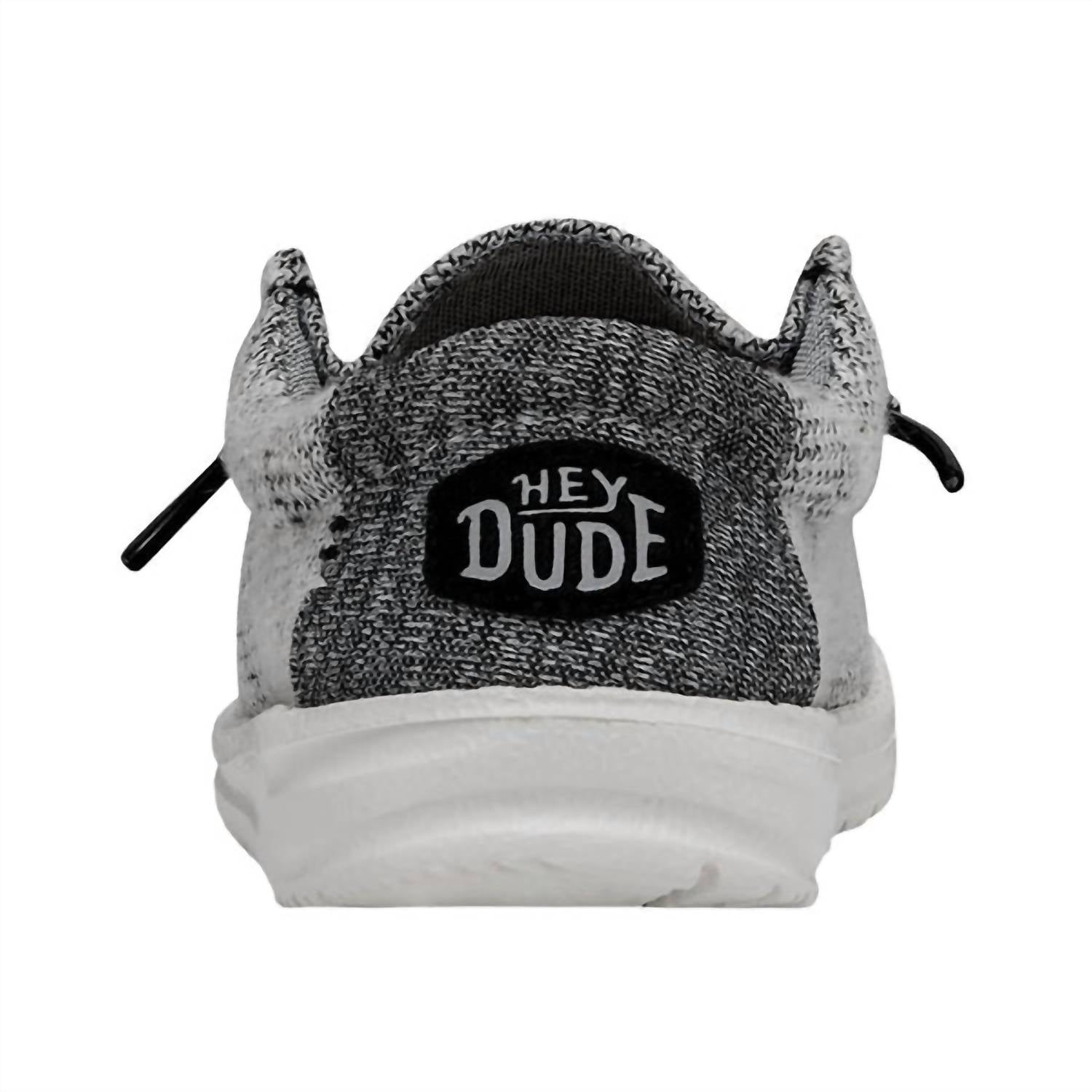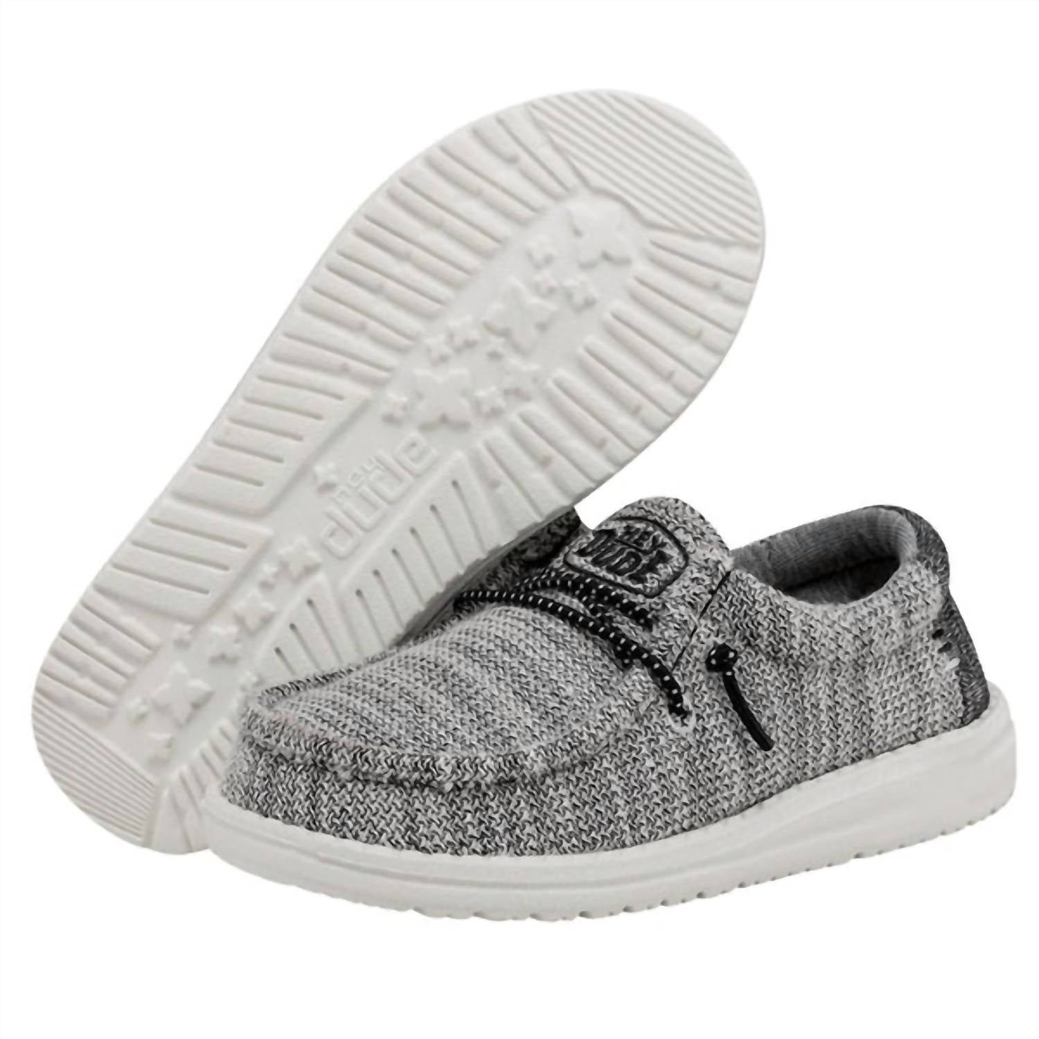 Introducing the Youth's Wally Stretch Slip On Shoes by HEY DUDE, perfect for boys looking for comfort and style. These sneakers feature a textile upper combined with a durable knit material, providing flexibility and support. The shoe is designed with elastic laces and a lightweight, flexible outsole, ideal for a relaxed fit during summer beach days or 4th of July festivities. With a removable foam insole and a flat heel measuring under 1 inch, these minimalist sneakers are travel-ready for any adventure.