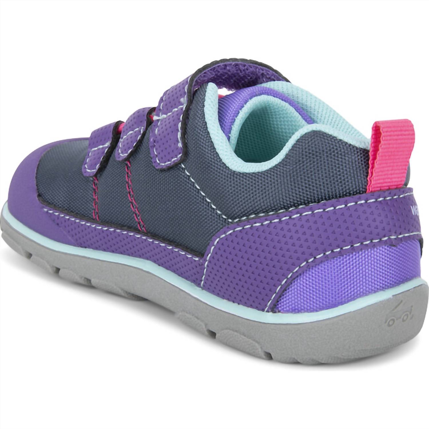 The Summit Purple Kid's Girl Athletic Shoe by See Kai Run is a stylish streetwear option for toddlers this spring, perfect for Easter celebrations. It features a round toe design crafted from a durable recycled nylon textile upper, enhanced with rubberized overlays, a rubber toe cap, and a 100% recycled TPR outsole. The interior consists of a recycled mesh lining and a removable mesh-lined sockliner, ensuring a healthy foot climate for your little one's adventures. Ideal for active play, these sneakers exemplify See Kai Run's commitment to sustainability and style.