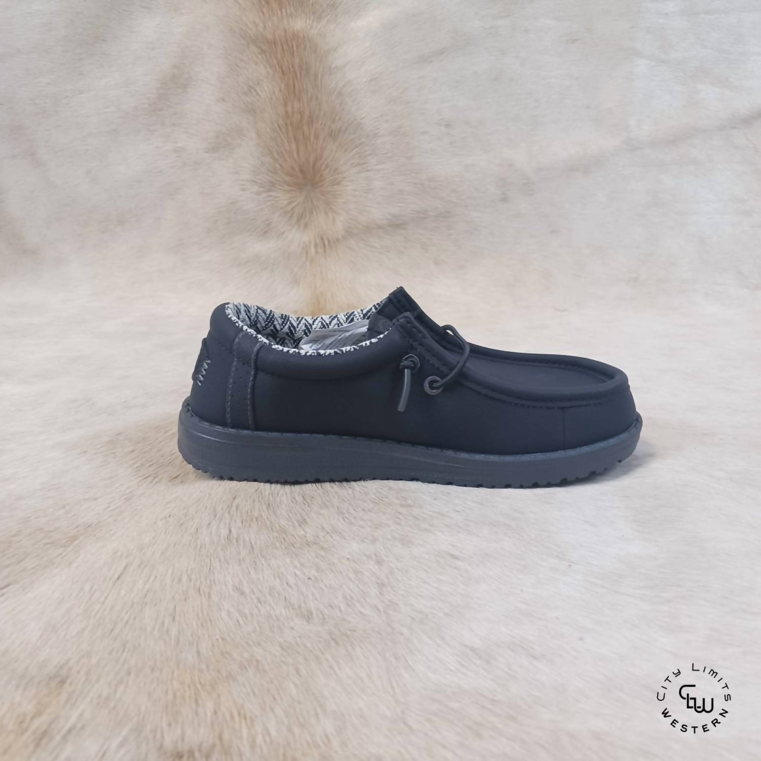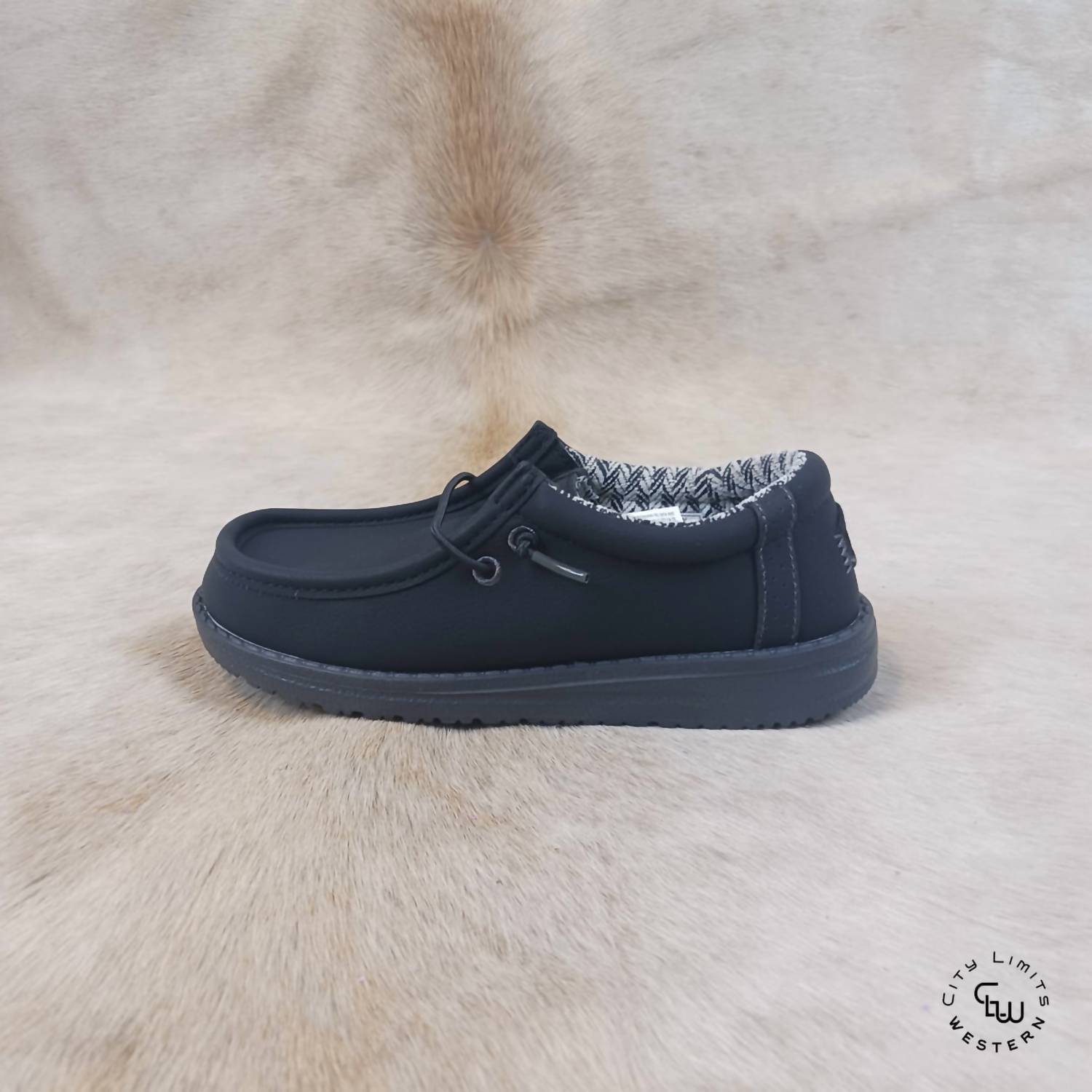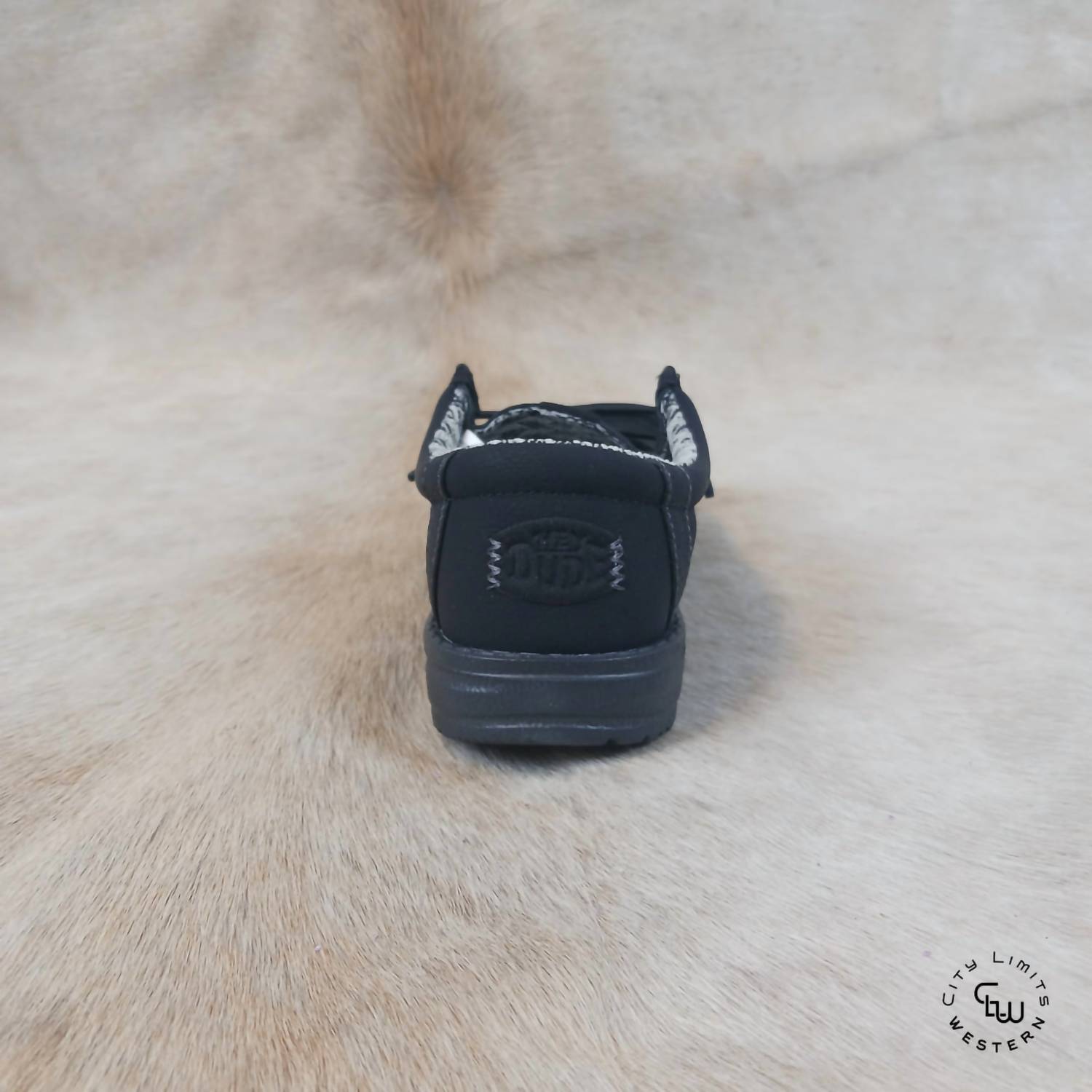Introducing the Kid's Classic Shoe by HEY DUDE, designed for little boys who appreciate style and comfort. Featuring a relaxed fit, this sneaker in a stylish black and charcoal colorway provides ample roominess for a laid-back, easygoing feel. Crafted with a round toe and flat heel, it's perfect for spring occasions and even a dinner party. Versatile and fashionable, it's a must-have for any little kid's wardrobe.