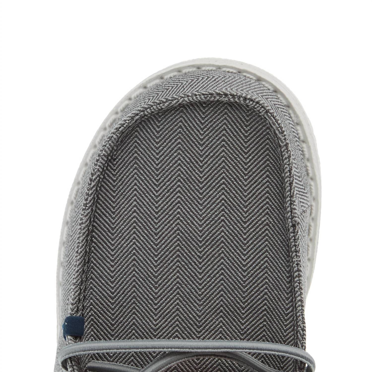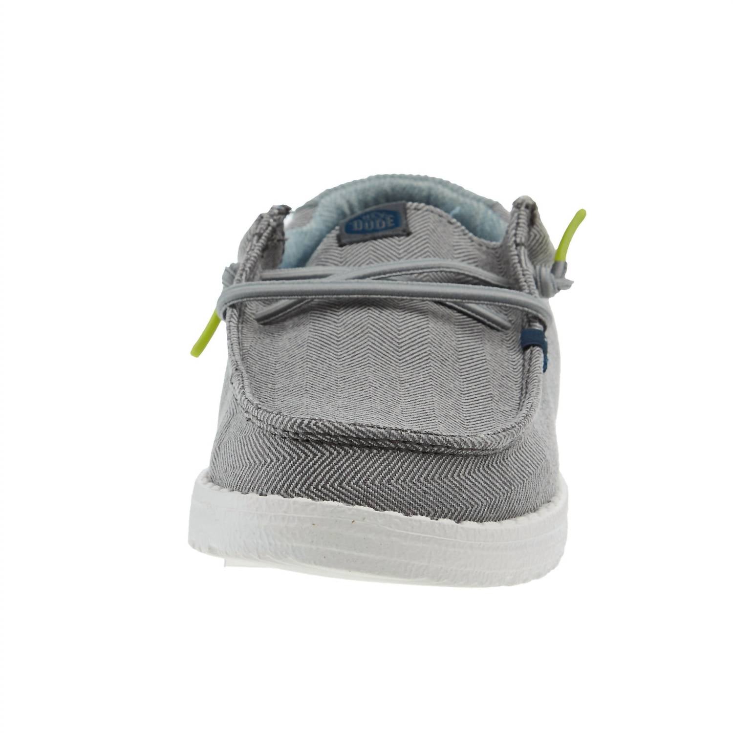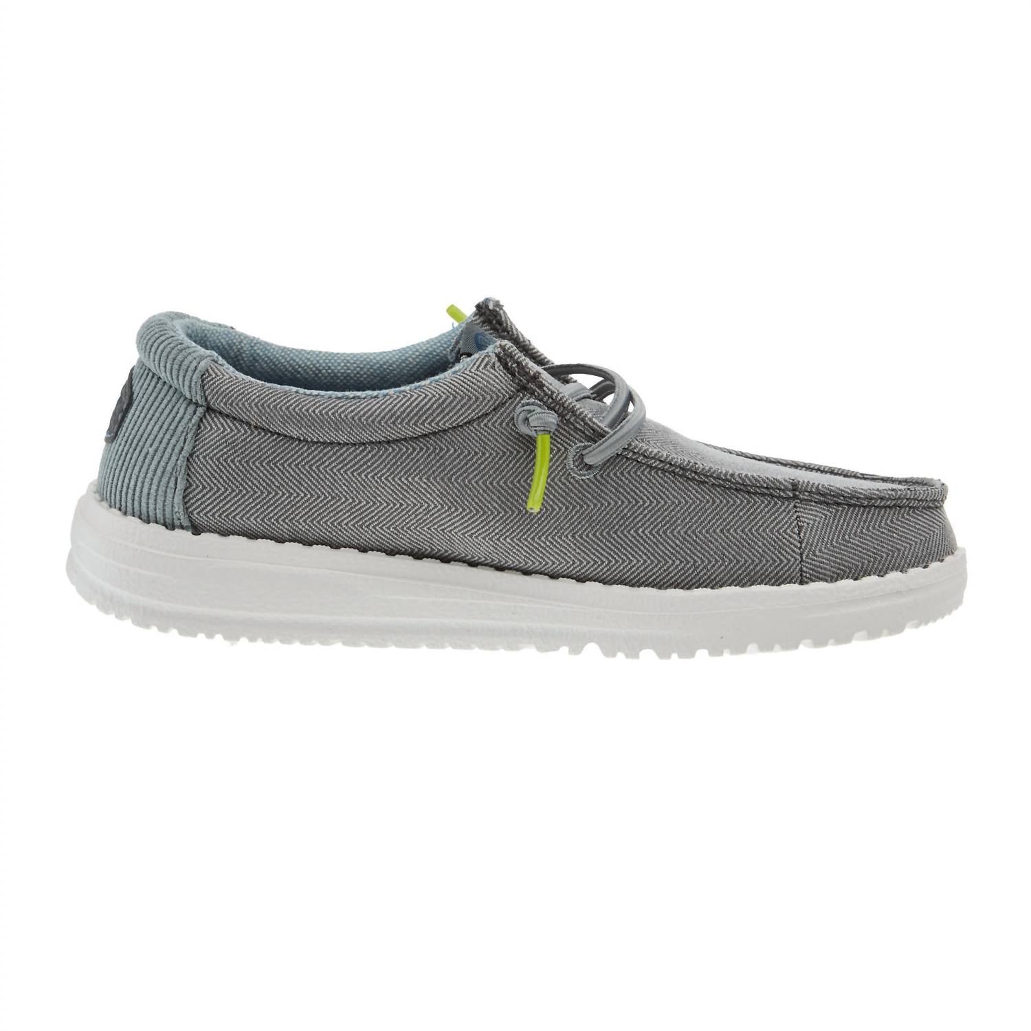 Step into comfort with the Kids Wally Shoes by HEY DUDE. These Herringbone Charcoal sneakers feature a round toe design perfect for little explorers. Crafted from durable canvas, they are tailored for toddler boys, ideal for back-to-school season. Perfectly suited for fall, these streetwear-inspired shoes offer a trendy yet practical option for any young adventurer.