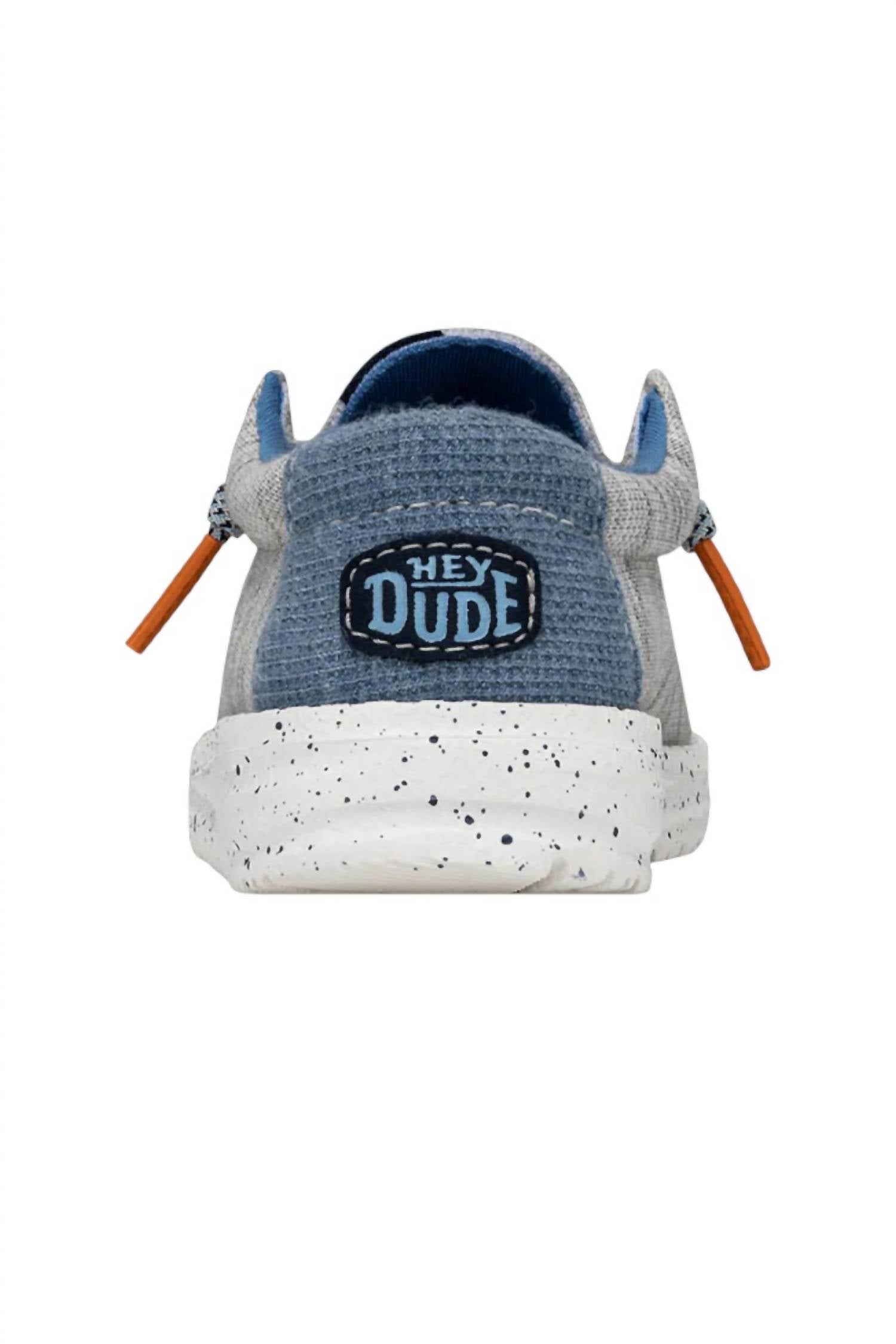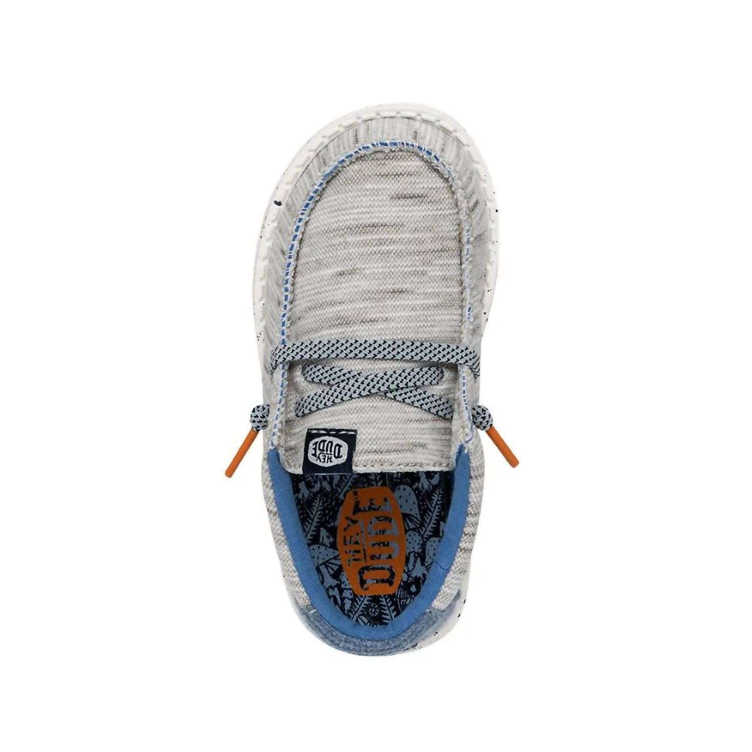 Introducing the Toddler's Wally Jersey Shoes by HEY DUDE, a perfect fusion of comfort and style for your little one. These light grey sneakers feature a textile upper and elastic laces, making them easy to slip on. With a lightweight and flexible outsole, they ensure unrestricted play over any surface. The removable foam insole and easy-to-wash design underscore its practical functionality, ideal for the active birthday boy.
