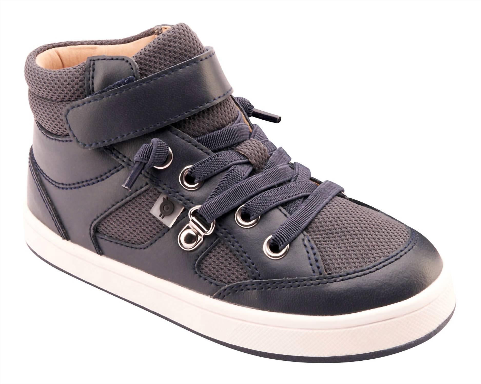 Discover the Oldsoles Boys Work Kicks High Top Sneakers, designed for both style and functionality with a durable leather construction in classic navy. These sneakers feature a round toe and a high top design for added ankle support. Closure is secured by elastic laces and a Velcro strap, ensuring a snug fit for active kids. Perfect for fall streetwear and special occasions like Thanksgiving engagements.