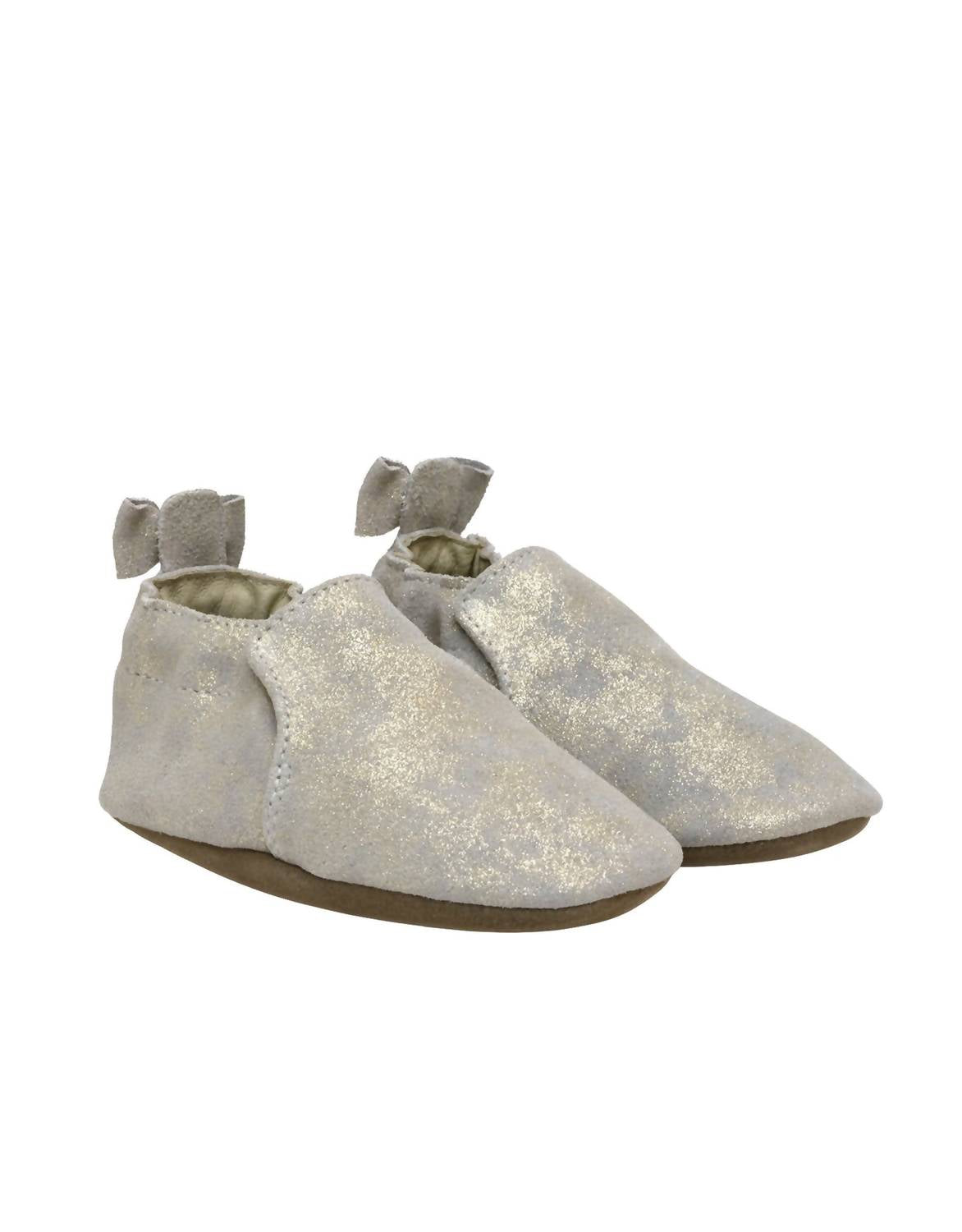 Robeez presents the Girl's Pretty Pearl Soft Soles Crib Shoes, a perfect blend of style and comfort for your little one. These gold, preppy sneakers feature a premium suede upper and a soft suede sole that flexes with every step, promoting healthy foot development. An elasticized ankle ensures a kick-proof fit, making them easy to slip on and off, while the slip-resistant sole helps keep your child steady during their first adventures. Ideal for casual spring outings, these shoes are designed for babies and approved by the American Podiatric Medical Association for their comfortable, barefoot feel. Spot clean with a mild detergent and damp cloth.
