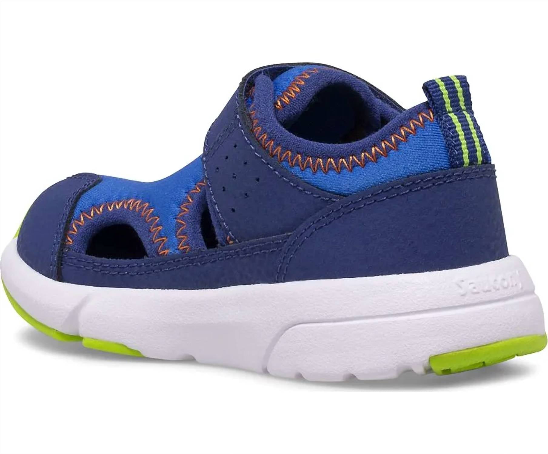 Meet the Boy's Quicksplash Jr Sneakers by SAUCONY, styled in vibrant blue and green for any water-filled adventure. These sneakers boast a water-friendly Lycra upper with an easy alternative closure for quick on and off wear. Designed with a round toe and flat heel, the anti-stink lining ensures freshness, while the non-marking outsole features deep flex grooves and rubber traction pods for robust grip. Ideal for back-to-school streetwear during the spring season.