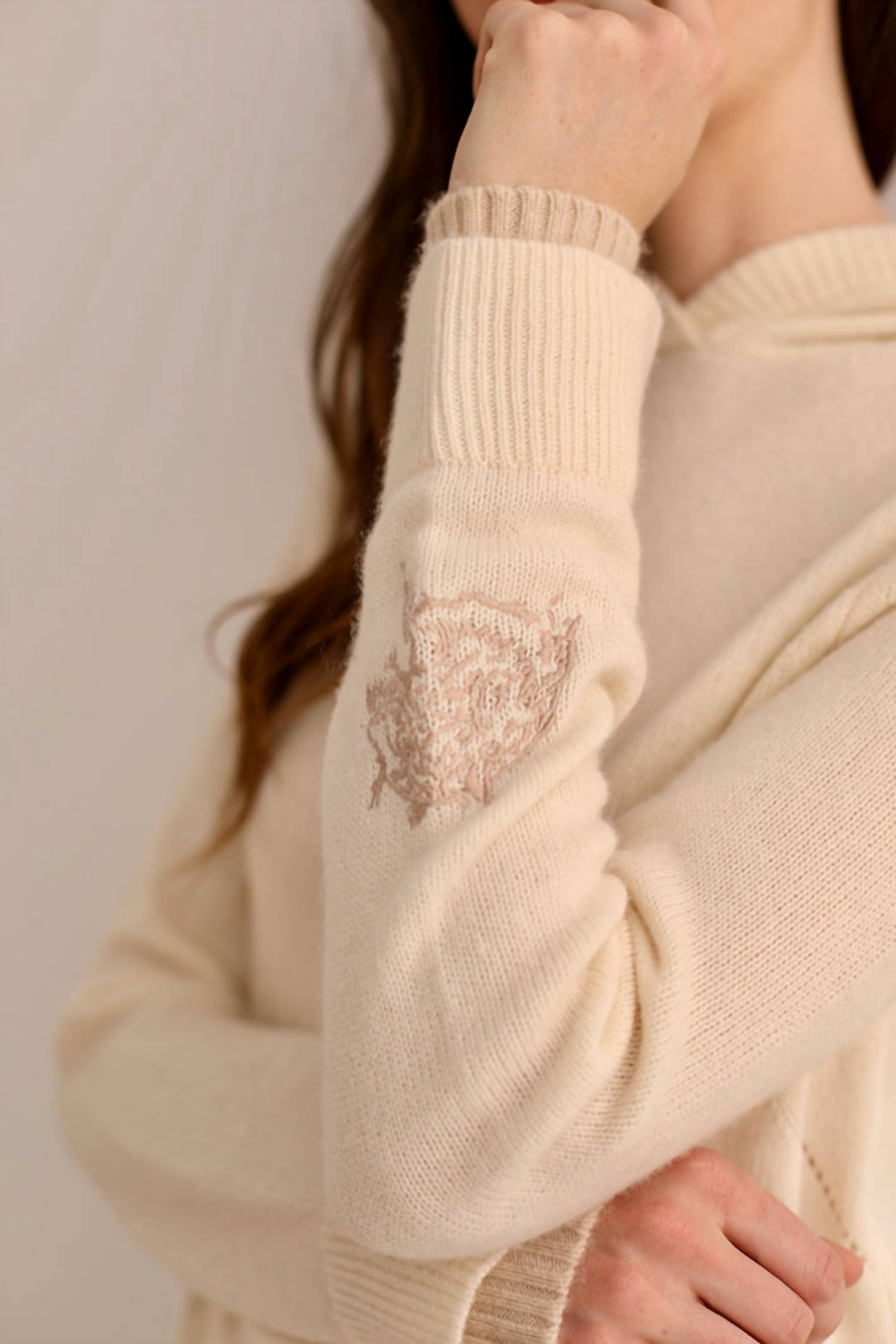 Cooler temps call for layering and we love this adorable sweatshirt for all the obvious reasons. Embrace warmth and elegance with the Cheetah Embroidered Hoodie by Las Sureñas Arg. Designed with long sleeves and a luxurious blend of 70% wool and 30% cashmere, this cream-colored hooded sweatshirt is a statement in comfort. It features practical front pockets and unique cheetah embroidery on one wrist, making it perfect for a minimalist vacation look. Closure: Pull-on. Suitable for fall and ideal for adding a touch of sophistication to Thanksgiving or any special occasion.