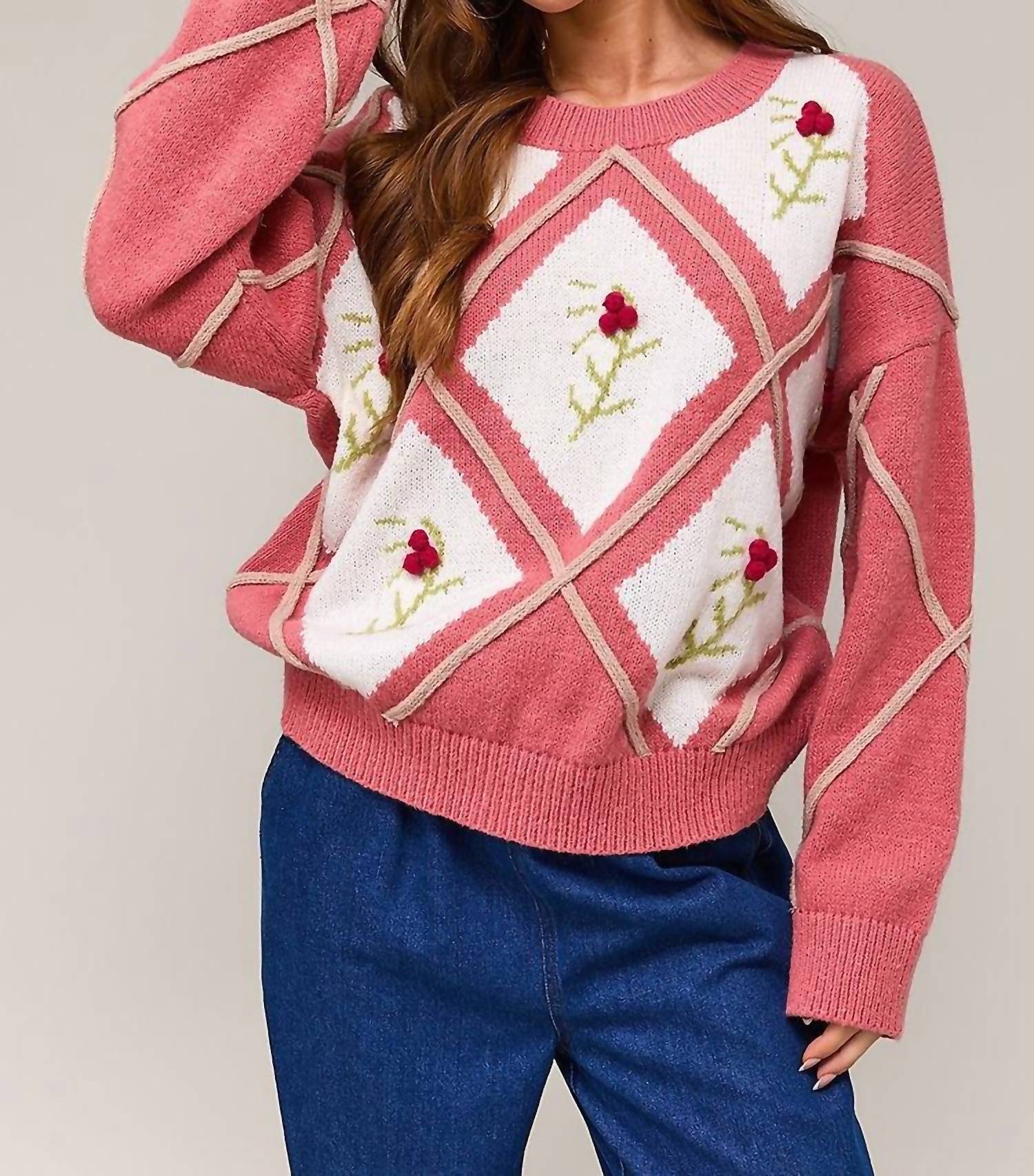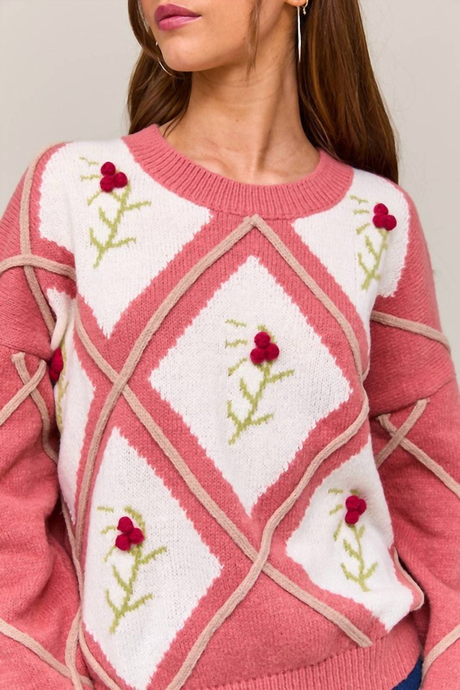 The ultimate go-to sweater, expertly crafted to provide the perfect combination of warmth and style. Its classic design and soft fabric make it a must-have addition to your wardrobe. Discover the Enchanted Woods Sweater by LE LIS, a charming addition to your Fall wardrobe in a delightful pink hue. This women's crewneck sweater, with its long sleeves, is crafted from 100% polyester and adorned with a subtle argyle pattern and floral pom poms. Made for a preppy look, it offers comfort with a cozy knit and a convenient pull-on closure. For best care, dry clean only.