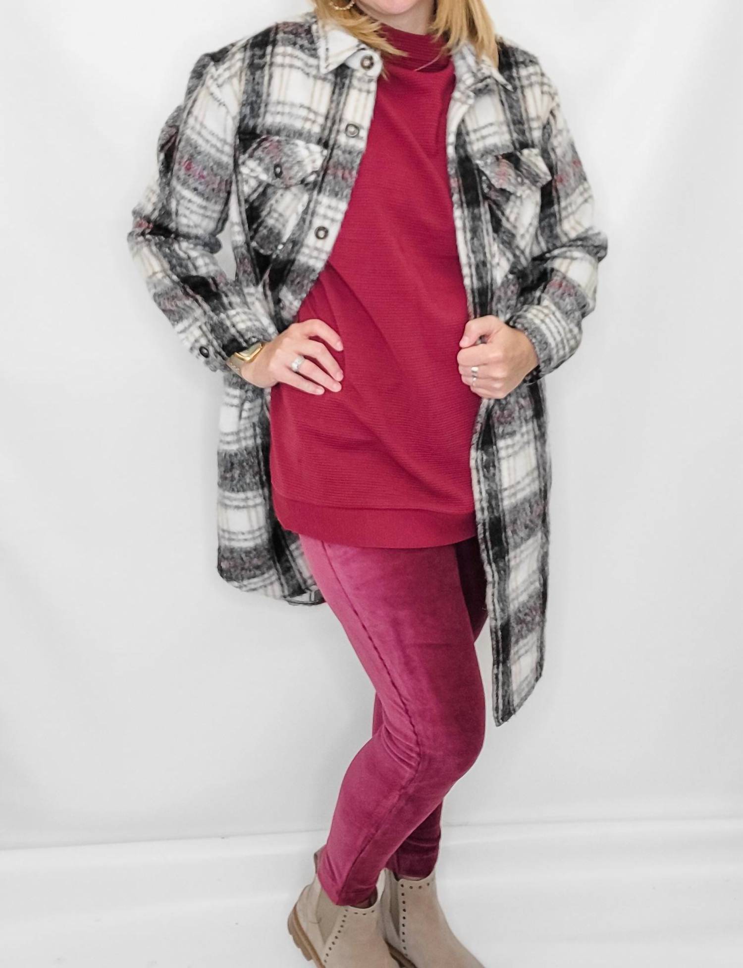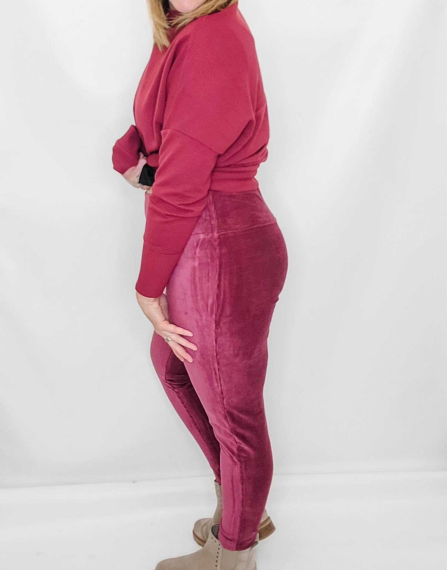 Leggings you can dress up or down for any occasion. Elevate your fall and winter wardrobe with the TRIBAL Velvet Flatten It Leggings in stunning Ruby Wine. Crafted from a 60% cotton, 37% polyester, and 3% spandex blend, these leggings feature a ribbed velvet material and a wide, flattening waistband for comfort and style. The pull-on design ensures ease of wear, while the skinny leg silhouette offers a sleek look. Care instructions include machine wash delicate. Model Ali sized up to an x-large for a better fit, as velvet may have less stretch.