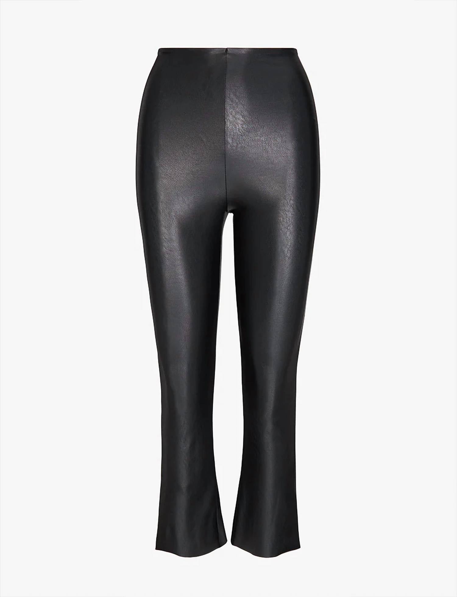The legging you didn't know you needed and you won't want to take off. Elevate your wardrobe with the Faux Leather Cropped Flare Legging by Commando, a chic choice for effortless style. Crafted in black with a viscose blend leg featuring a polyurethane coating and a nylon waistband, these leggings offer a real leather look and feel. Designed with a high-rise pull-on closure, they boast a front rise of 11.87 inches and an inseam of 25.12 inches, perfect for a flared leg silhouette. Enjoy four-way stretch, a signature smoothing internal waistband, and firming fabric with light compression. They are machine washable for hassle-free care.