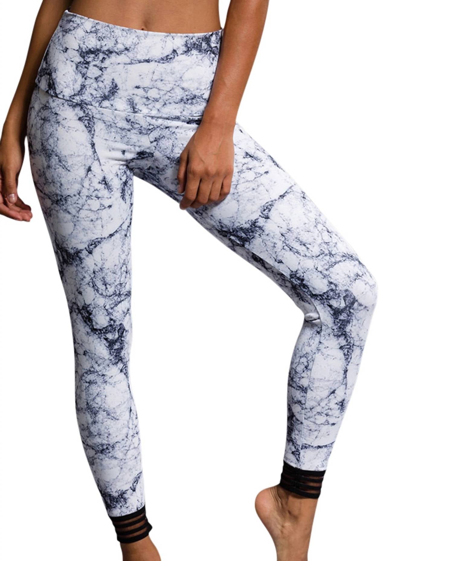 Leggings you can dress up or down for any occasion. Elevate your workout wardrobe with the Ritz Capri Style Leggings by Onzie, featuring a striking White Marble pattern. These capri leggings are designed with a high-rise waistband and a slim fit, showcasing unique velvet stripe and mesh ankle accents for a trendy twist. Crafted from 82% Polyester and 18% Spandex, they offer both comfort and flexibility. Closure: Pull On. Ideal for activewear and perfect for spring fitness sessions, these leggings capture a 90s fashion vibe with ease.