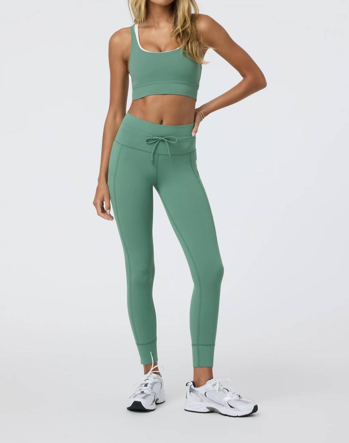 The legging you didn't know you needed and you won't want to take off. Elevate your athleisure collection with the Daily Pocket Legging by Vuori, crafted in hedge green for a bold look. These high-rise leggings feature practical side pockets, making them ideal for fitness or everyday wear. Made from 72% Polyester and 28% Elastane, the BreatheInterlockâ„¢ performance stretch knit fabric ensures 4-way stretch and moisture-wicking properties for comfort and a no-slip fit. With a 24.5" inseam, these leggings offer a smooth, airbrushed finish. Closure: Pull on. Care: Machine wash and tumble dry.