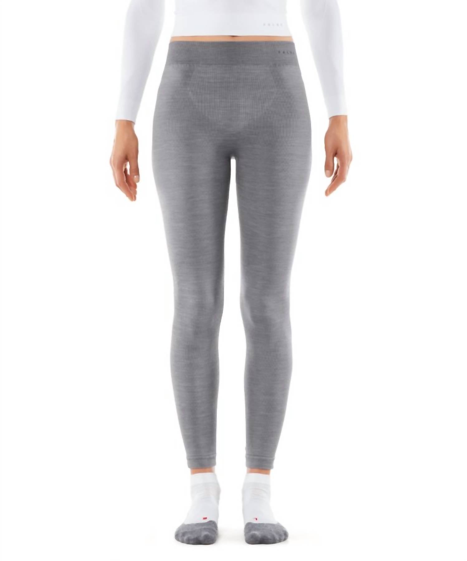 You'll be reaching for this best-selling legging all season long. Introducing the Falke Wool-tech Base Layer Bottoms in Grey Heather, designed for women's comfort and performance. These long leggings with a slim fit feature a composition of 55% wool, 43% polyamide, and 2% elastane, ensuring warmth and odor resistance. Their pull-on closure and high rise provide ease and coverage, while the wool blend offers perfect humidity and temperature regulation. Ideal for workout sessions or athleisure, they should be machine washed and laid flat to dry.