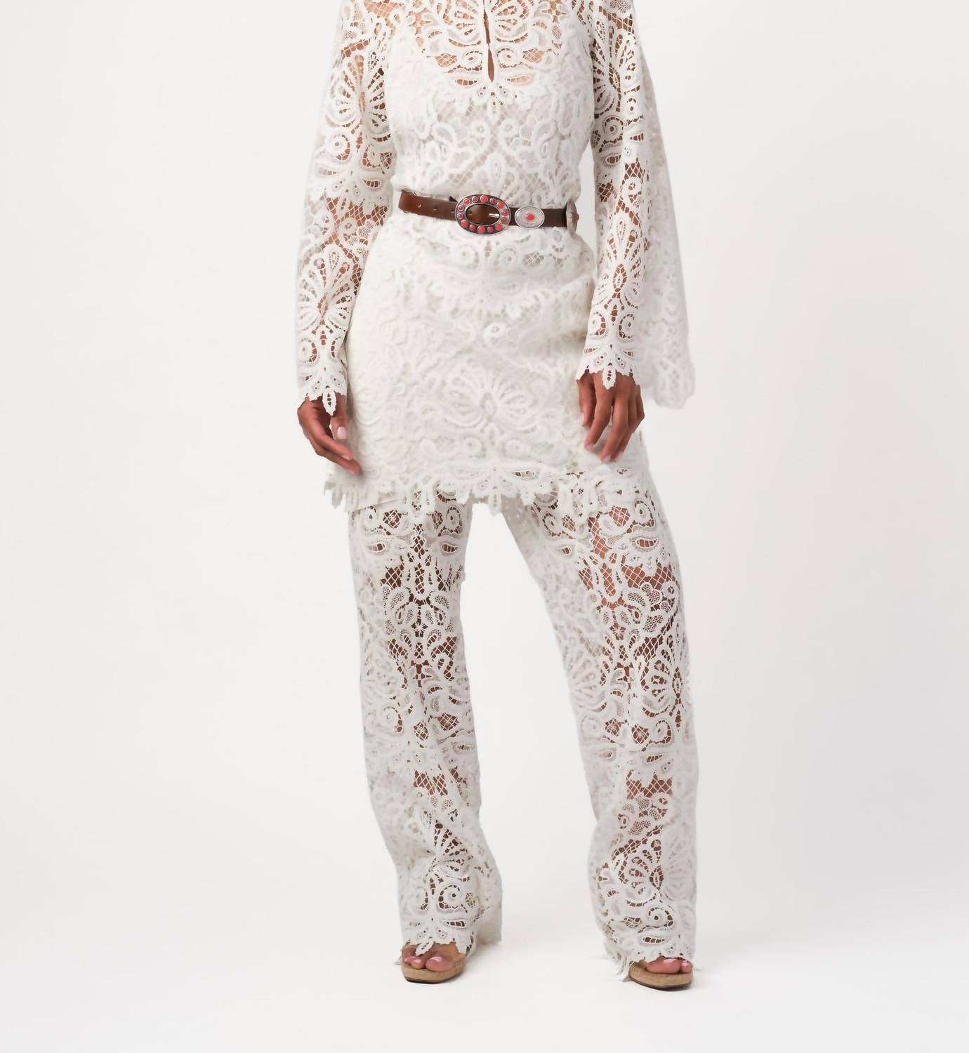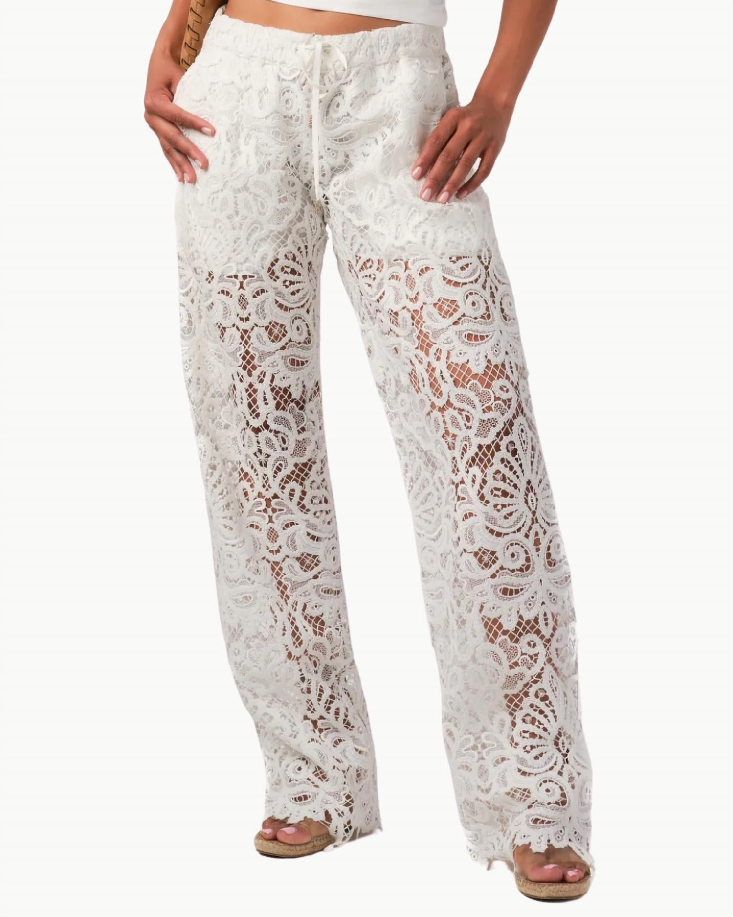 Leggings you can dress up or down for any occasion. Introducing the Brie Crochet Lace Pants by Calypso St. Barth, perfect for adding boho chic elegance to your summer wardrobe. These mid-rise pants feature a relaxed, straight-leg fit with a convenient pull-on style and an elastic waist. Made from 100% polyester with crochet lace construction, they come with side pockets and scalloped hems for added charm, while being lined with built-in shorts for comfort. Care instructions: Machine wash and tumble dry.