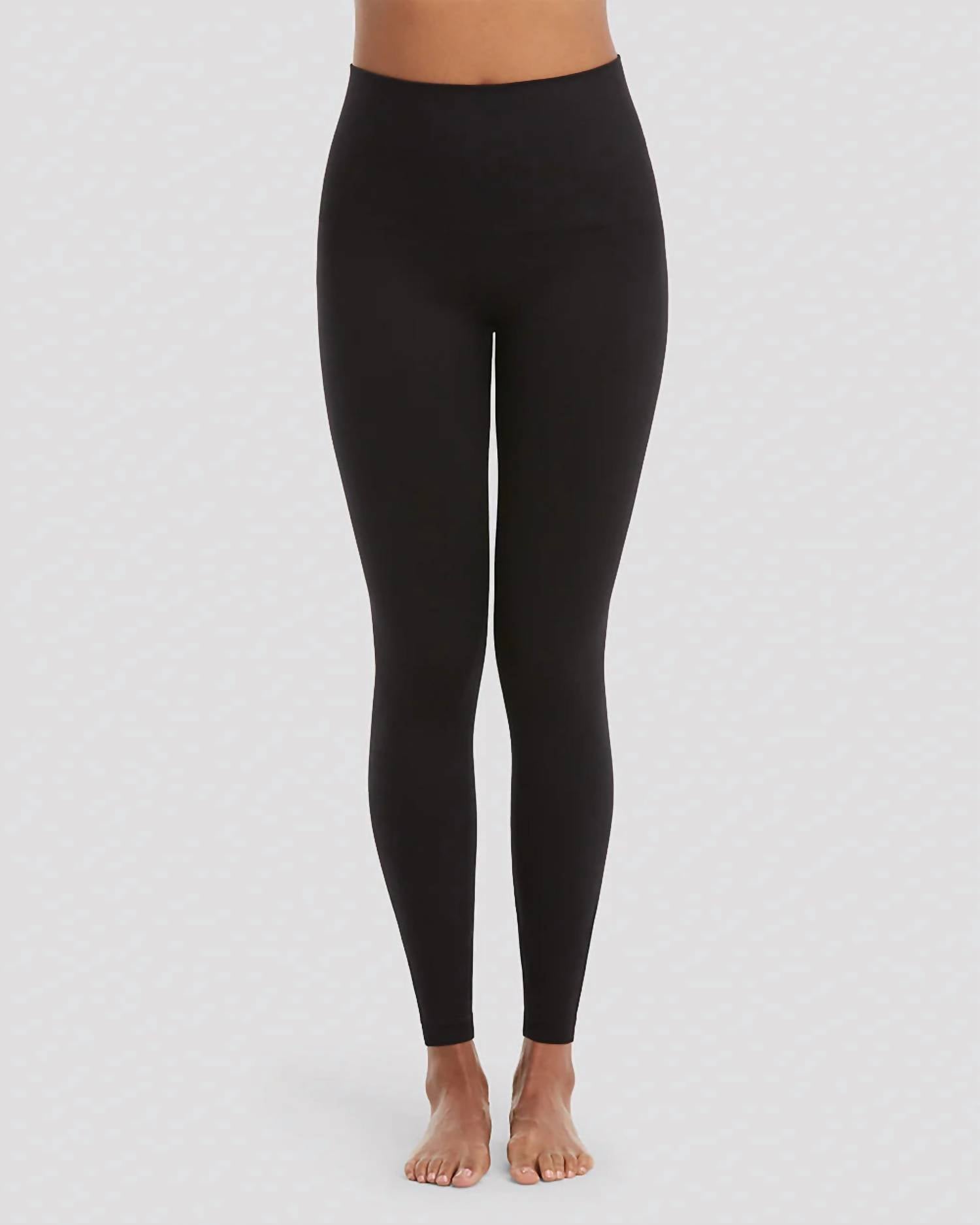 You'll be reaching for this best-selling legging all season long. Experience unparalleled comfort and eco-friendly style with the Spanx Seamless Shaping Leggings in Black. Crafted from a recycled 94% Nylon and 6% Elastane blend, these leggings feature a seamless design for all-around firmness, hitting at the natural waist for optimal coverage. Designed with a high-rise, slim fit, and a skinny leg style, these ankle-length leggings boast a 29" inseam. Closure: Pull-on. Care: Machine wash cold on a gentle cycle, tumble dry low, do not use fabric softener, and avoid ironing.