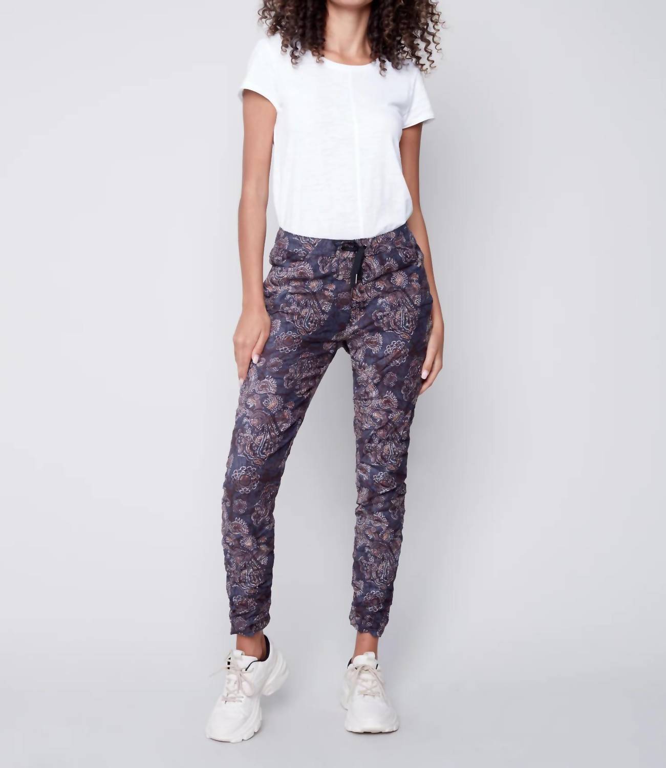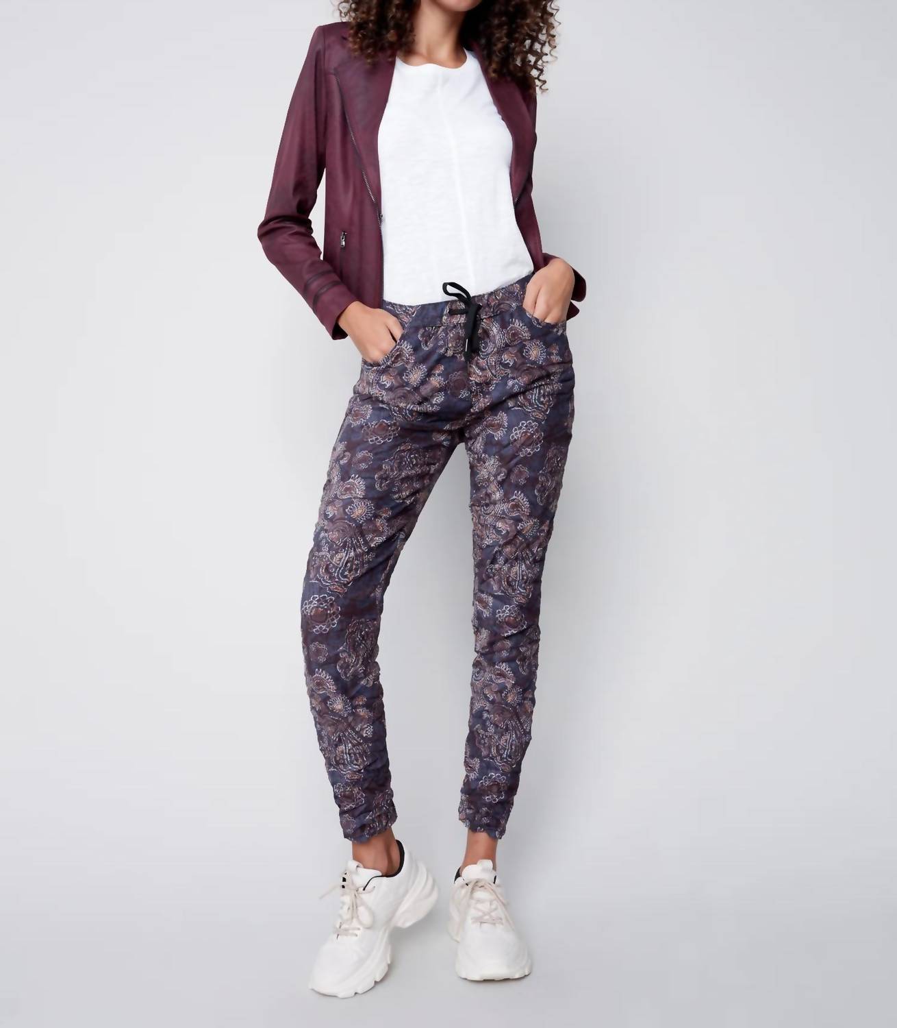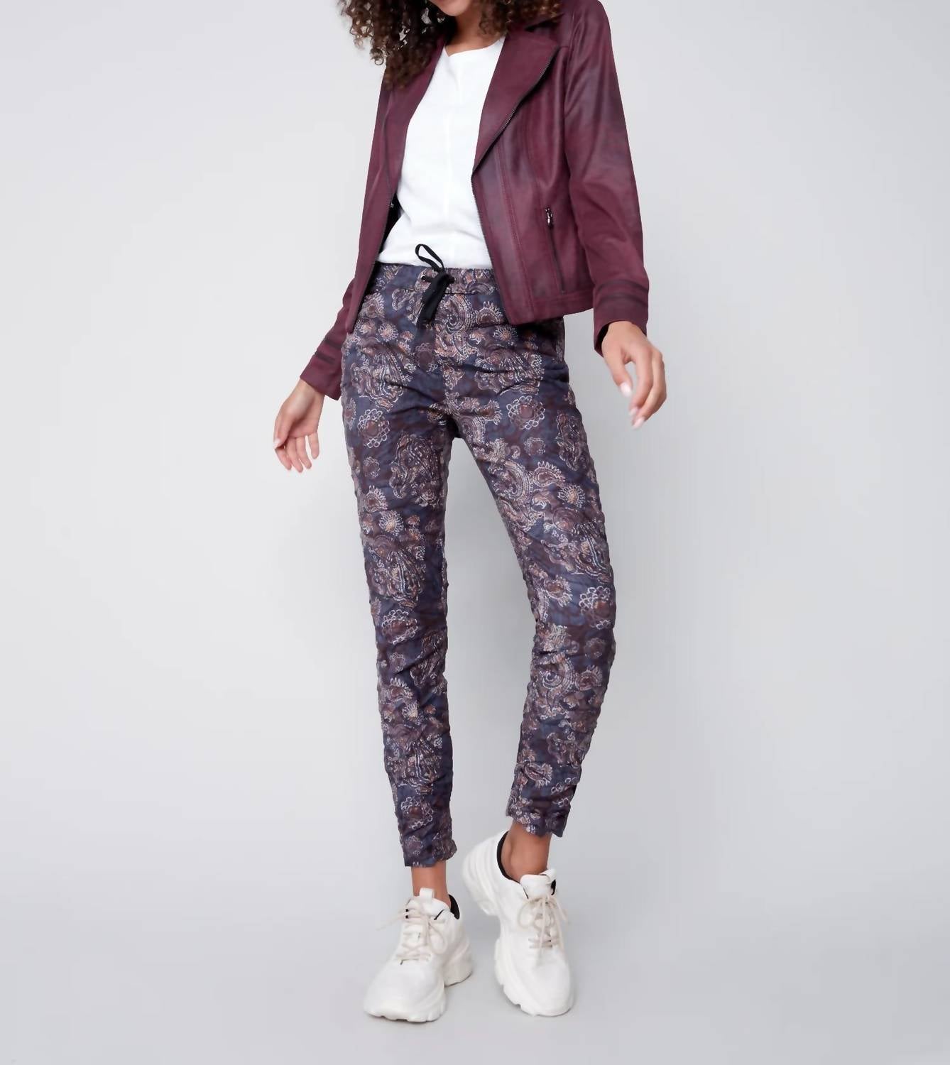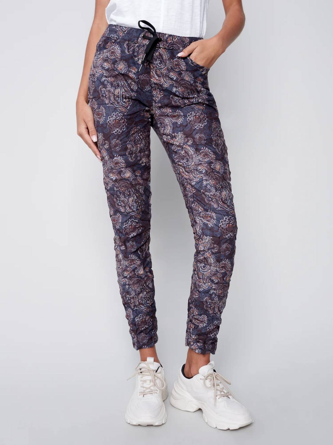 You'll be reaching for this best-selling legging all season long. These women's pull-on pants feature a paisley print on stretch suede fabric with a crinkle texture and drawstring waist. The pants are made of 92% polyester and 8% spandex for comfortable wear.