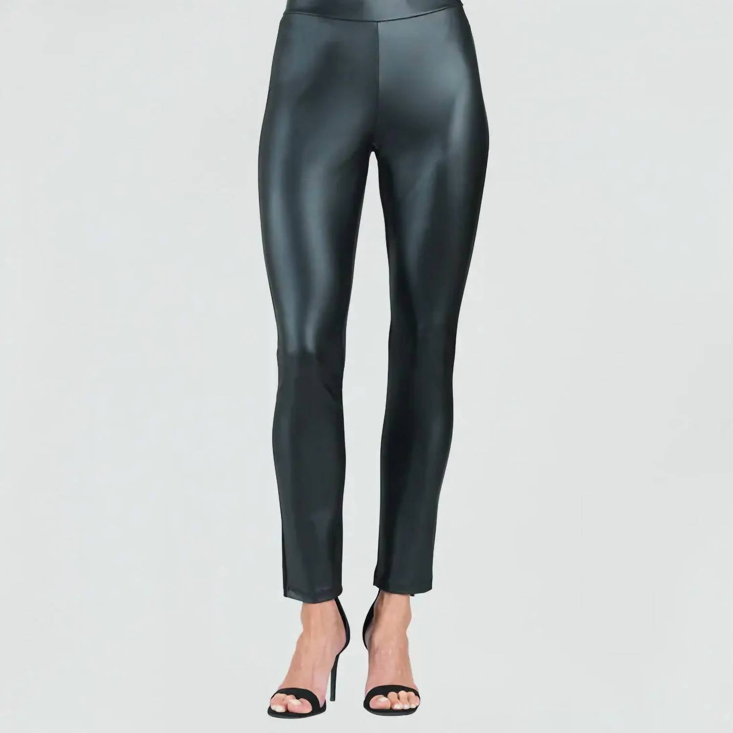 The legging you didn't know you needed and you won't want to take off. Elevate your night out with the CLARA SUNWOO Liquid Leather Sheen Signature Leggings in classic black. These high-rise leggings offer a slim fit with a skinny leg style crafted from 85% Polyester and 15% Elastane, featuring a vegan-friendly, soft sheen finish for a luxe look. Closure: Convenient 1” elastic pull-on waistband. Care: Machine wash and line dry for easy maintenance. These leggings are perfect for spring occasions like a Thanksgiving dinner party, exuding quiet luxury with their solid pattern and sleek styling.