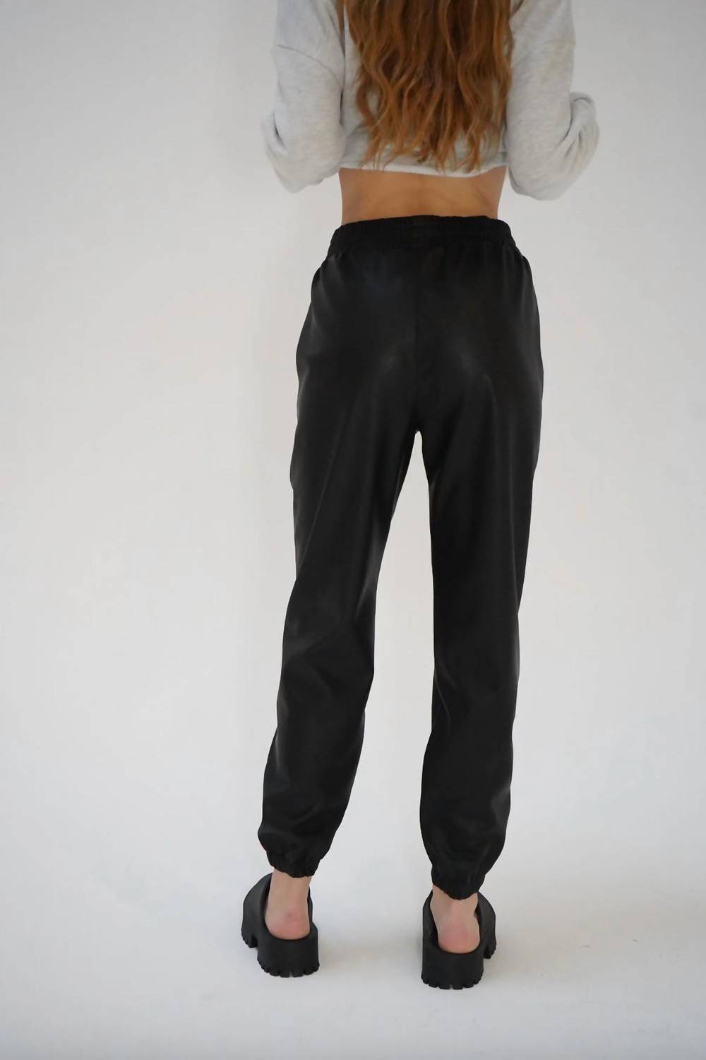 Introducing the Utility Faux Leather Jogger by LNA, a sleek and stylish addition to your wardrobe in classic black. These track pants feature a slim fit with a convenient pull-on closure, crafted from 55% Polyester and 45% Polyurethane for that ultimate faux leather appeal. Designed in Los Angeles, this piece offers a tapered leg style and pairs effortlessly with your favorite vintage tee or tank. Care instructions recommend dry cleaning only to maintain the luxurious finish. Model is 5'9.5" and wearing a size small.