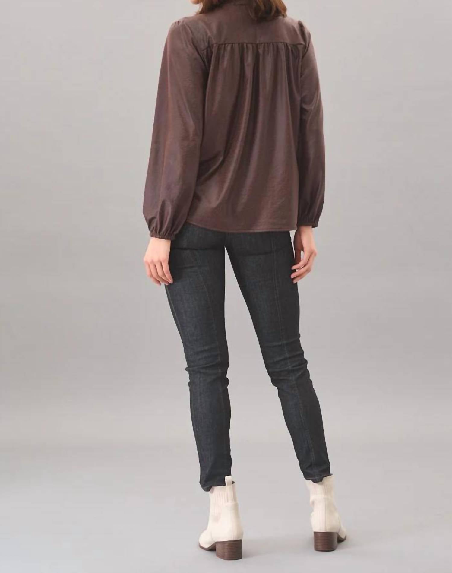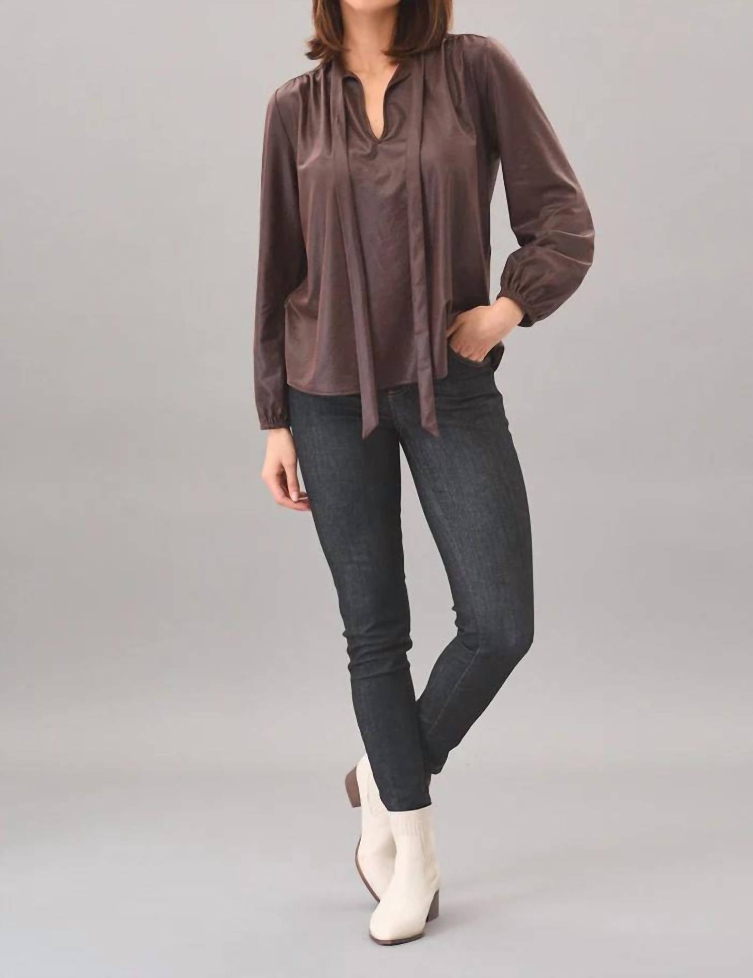 A versatile blouse that works from desk to dinner! Discover the Zoe Leatherette Top by Lola & Sophie, an elegant blouse in a chic leather color, perfect for elevating your wardrobe. Featuring long puff sleeves with soft elastic cuffs and a sophisticated tie neck with a split V-neck opening, this top offers both style and comfort. Made from 88% polyester and 12% elastane, the Zoe Leatherette Top has a relaxed, easy fit and measures 26 inches in length from the shoulder. Crafted with a pull-on closure, this garment is easy to maintain with machine wash and line dry care instructions. Model is 5'10" and is wearing a size S.