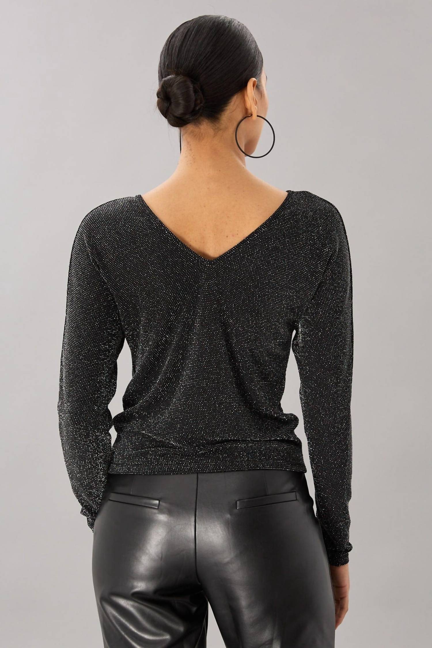 A timeless blouse that will never go out of style. Elevate your wardrobe with the Shimmer Scrunch Top by Lola & Sophie, a statement piece in a textured black with long sleeves and a V-neck. This versatile blouse crafted from soft knit fabric allows you to adjust the length and neckline with a functional drawstring, creating a snug fit around the bottom. Composition: 92% Polyamide, 5% Elastane, 4% Lurex; Country of Origin: USA. Closure: Pull-on. Care: Machine wash cold, lay flat to dry.