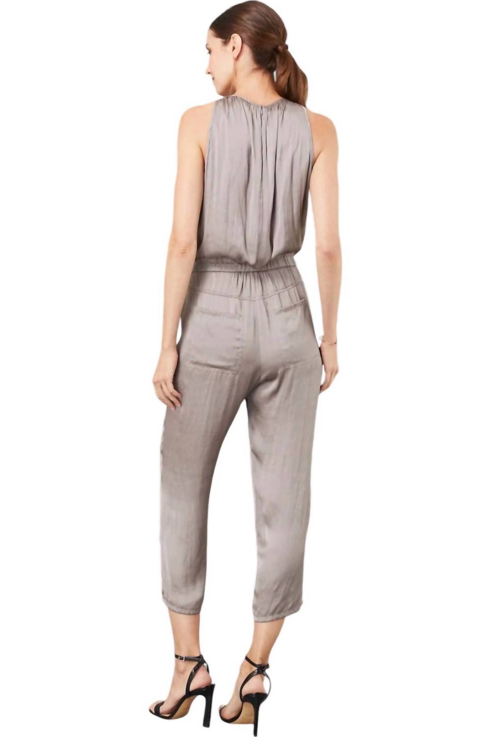 Throw it on and go! Designed for the modern woman who appreciates a blend of sassy and classic. High-neck jumpsuit in a subtle taupe hue exudes an effortless charm. Meticulously crafted from 100% polyester. Vintage satin finish. Elegant sheen that catches the light just right. Features a flattering elastic waist and a convenient back zipper closure. Offering both form and function. High-rise silhouette and straight-leg cut. Provides a polished look while ensuring comfort. Designed to be machine washable, it offers ease of care.