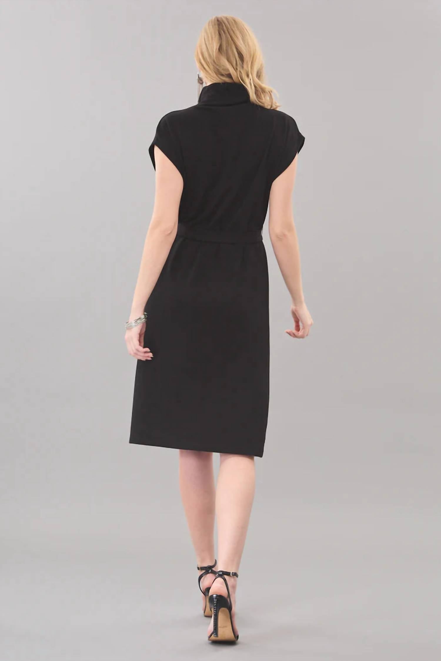 A midi dress so versatile, your options for wearing it are endless. The Belted Luxe Ponte Dress by Lola & Sophie is a sophisticated choice in solid black for an elegant yet comfortable look. This short-sleeve dress features a flattering mock neck and a shift design with a drop shoulder for a relaxed yet polished fit. The luxurious blend of 96% Viscose and 4% Elastane ensures a smooth finish and the garment measures 44" in length from the shoulder. Designed for ease, it comes in a pull-on style and should be machine washed and laid flat to dry.
