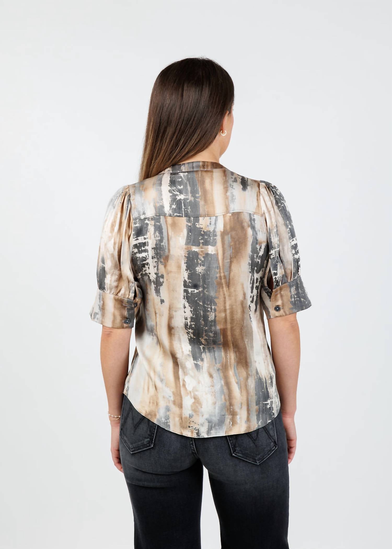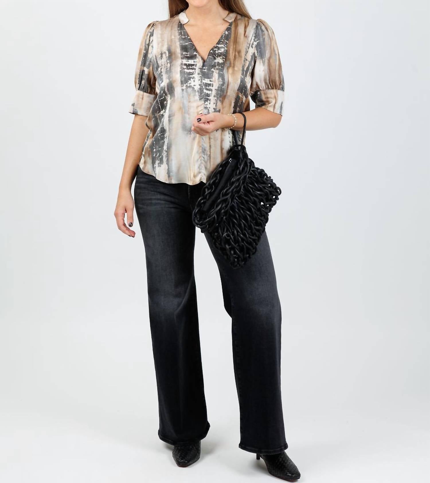 A timeless blouse that will never go out of style. Discover effortless sophistication with the Venetian Blouse by Lola & Sophie in Charcoal, featuring elbow-length sleeves and a chic V neckline. Crafted from 100% viscose, this lightweight and breathable blouse showcases an earth-tone abstract pattern perfect for adding a touch of boho chic to your wardrobe. The pull-on style blouse embodies a relaxed fit, making it ideal for versatile dressing. Faryn, standing 5'6" with a 34" bust, 28.5" waist, and 31" hip, perfectly models a size small.