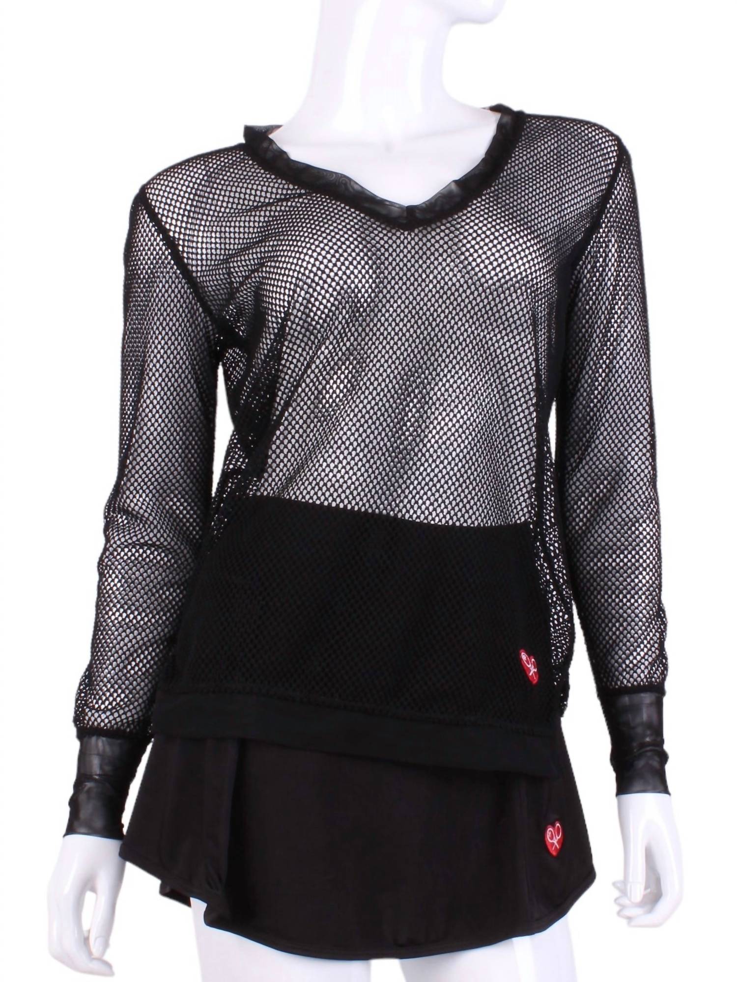 A long sleeve top you can wear with denim, skirts, well... just about anything! Discover the Fishnet Long Sleeve Very Vee Tee from Love Love Tennis, an alluring piece perfect for a chic game day look. This black, textured top features a daring V-neckline that adds a seductive touch to its athleisure trend appeal. The pull-on style offers ease and comfort, while its long sleeves make it suitable for summer. Ideal for activewear enthusiasts, this tee blends flair with function.