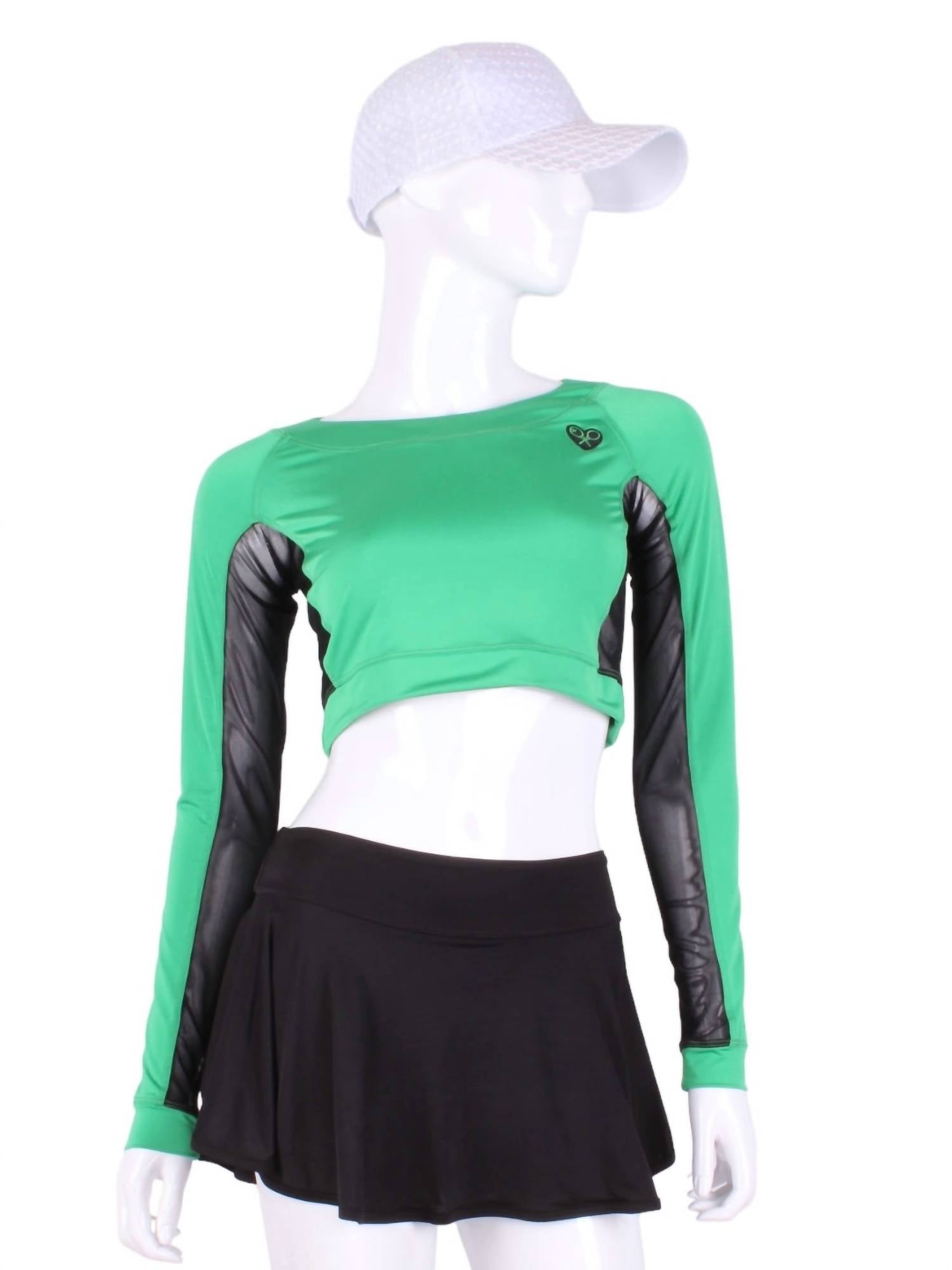 Pair this crop top with your favorite high-waisted jeans or maxi skirt. Elevate your athleisure wardrobe with the Love Love Tennis Women's Mesh Crop Top in a stylish green and black pattern. Designed with long sleeves for sun protection, this top features mesh under the arms to keep you cool during game day. This patterned, pull-on crop top offers easy access to back pockets and sports a crewneck, making it ideal for active summer days. Perfect for game day and transitioning from court to cocktails with ease.