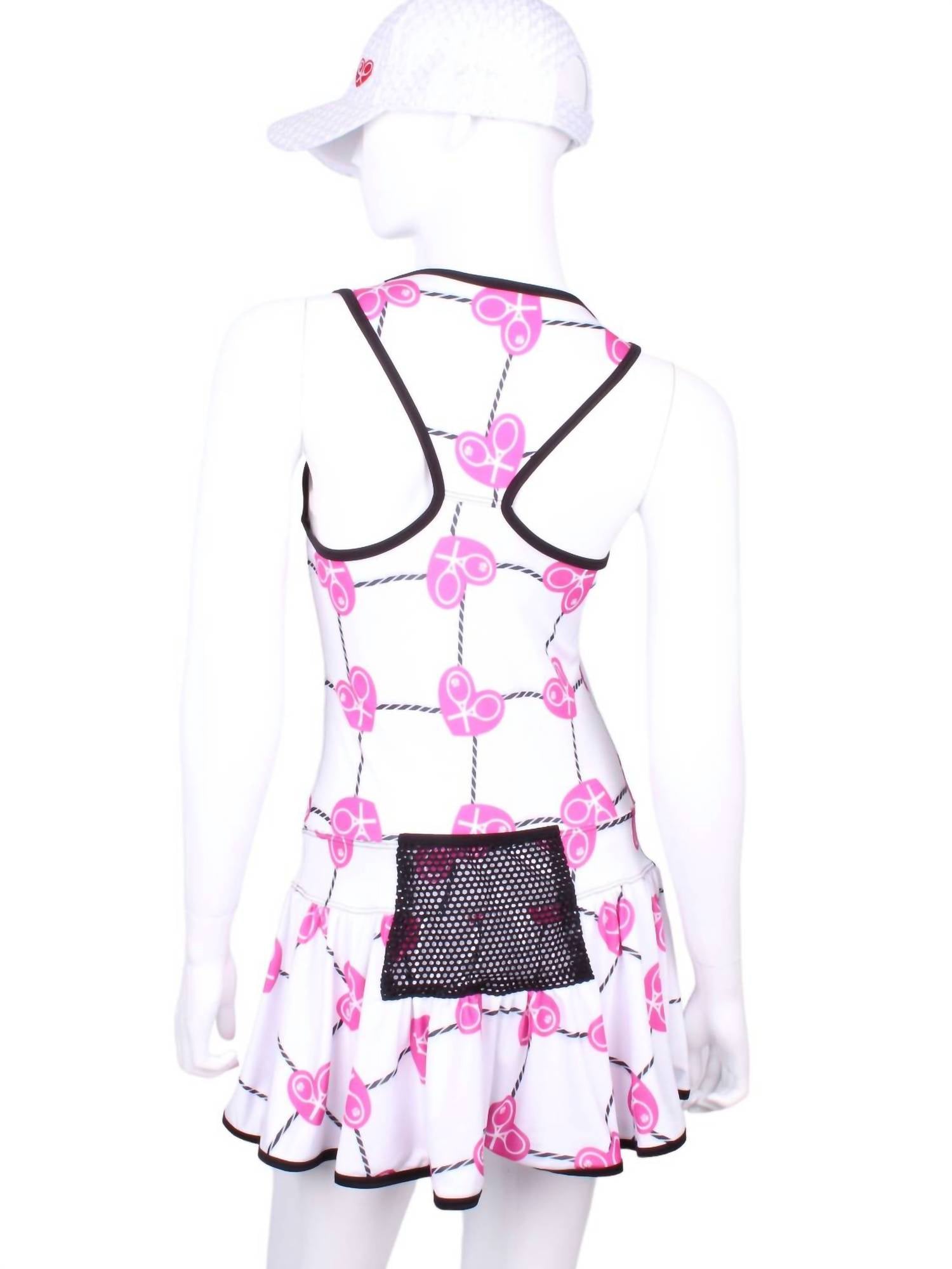 A short and breezy dress for those warmer days. The Women's Limited Sandra Dee Court Tennis Dress by Love Love Tennis combines playful elegance with athletic functionality. This sleeveless, A-line mini dress is designed for active women, featuring a flattering scoop neckline and a fun Pink Hearts & Net pattern. Crafted for comfort and flexibility, it's perfect for game day activities like tennis, running, and golf, with a supportive fit that complements your curves. Closure: Pull-on. Care: Machine wash cold, line dry. Each piece is a limited edition, with only three available per size.