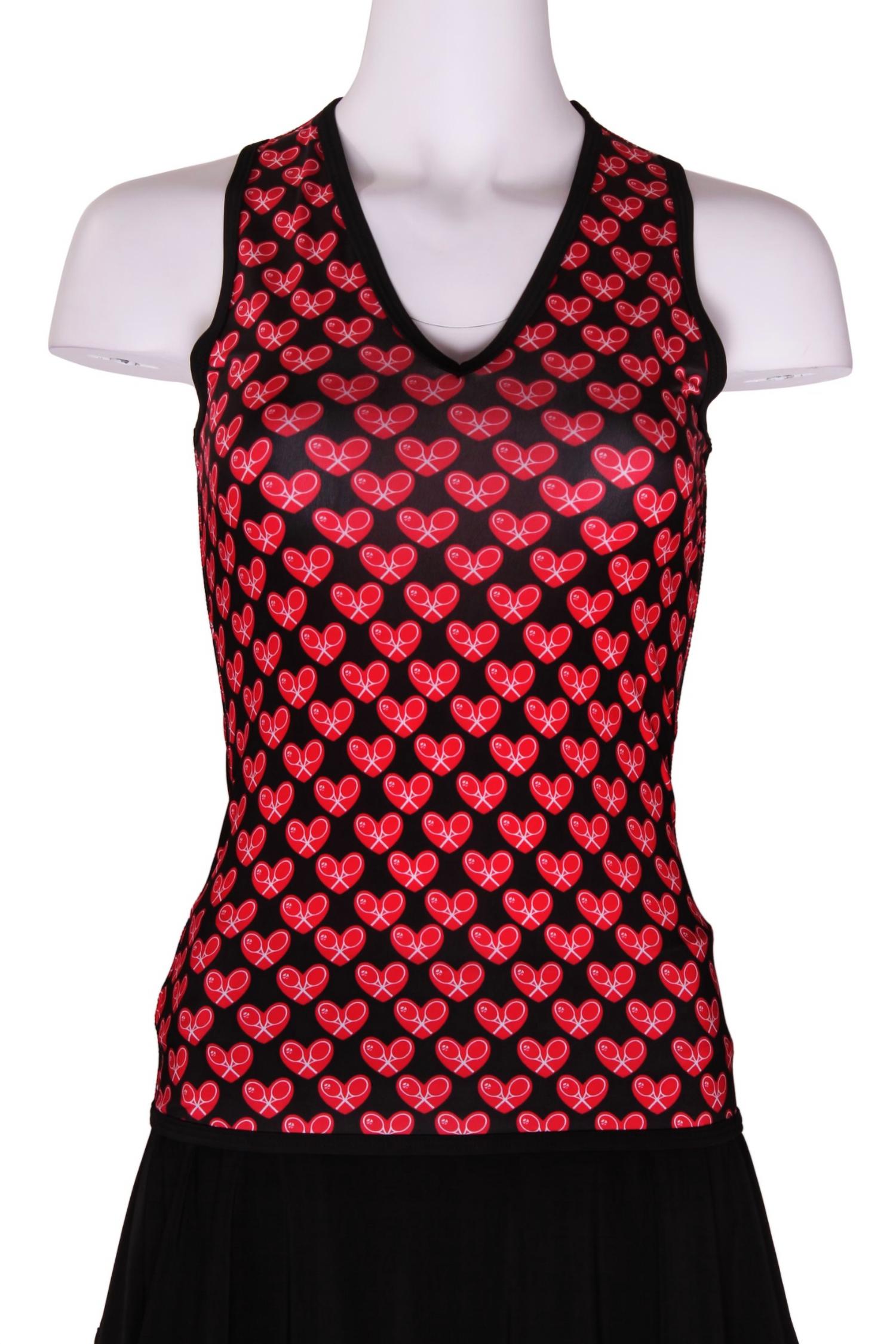 Fit, fabric and functionality. This tank top checks all the boxes. Elevate your fitness wardrobe with the Mini Heart Tennis Tank Top by Love Love Tennis, a sleeveless athleisure piece perfect for spring workouts. Crafted from stretchy and soft fabric, this V-neck tank features a pull-on closure for ease and a charming mini heart pattern in black and red for a touch of limited edition luxury. Each piece is designed in Downtown Los Angeles from imported fabric, ensuring both comfort and a flattering fit. Care for this exquisite top with a gentle hand wash and lay flat to dry.