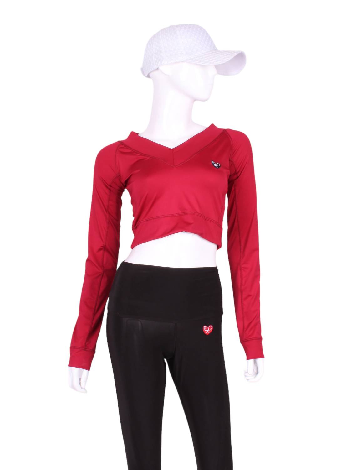 Show a little skin in this cute and casual crop top. Introducing the Love Love Tennis Women's Vee Crop Top, perfect for game day with a hint of athleisure flair. This long sleeve crop top offers valuable protection from the sun, combining chic raspberry red fabric with black mesh to keep you cool on the court. Designed with a V-neck and a pull-on closure, it allows easy access to back pockets for added convenience. Ideal for athletic wear, this top effortlessly transitions from court to cocktail.