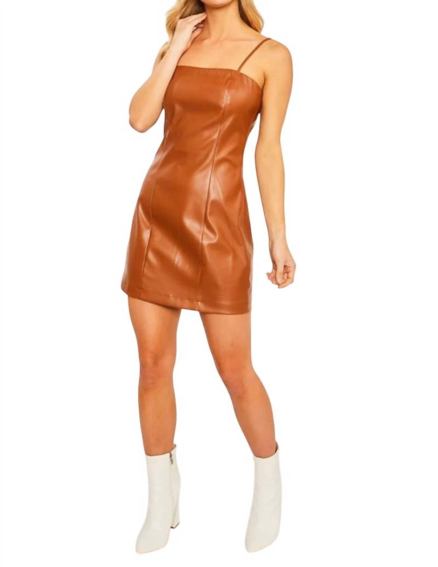 The kind of easy and flattering dress you'll be reaching for all season long. Embrace edgy sophistication with the Janis Vegan Leather Strap Mini Dress by LOVE TREE, a must-have in rich brown. Featuring adjustable spaghetti straps and a square neckline, this dress is crafted from 100% polyurethane for a sleek fit. Its A-line silhouette and mini length are accentuated by a fitted waist and silver back zipper closure. Care for this imported piece by hand washing cold and line drying.