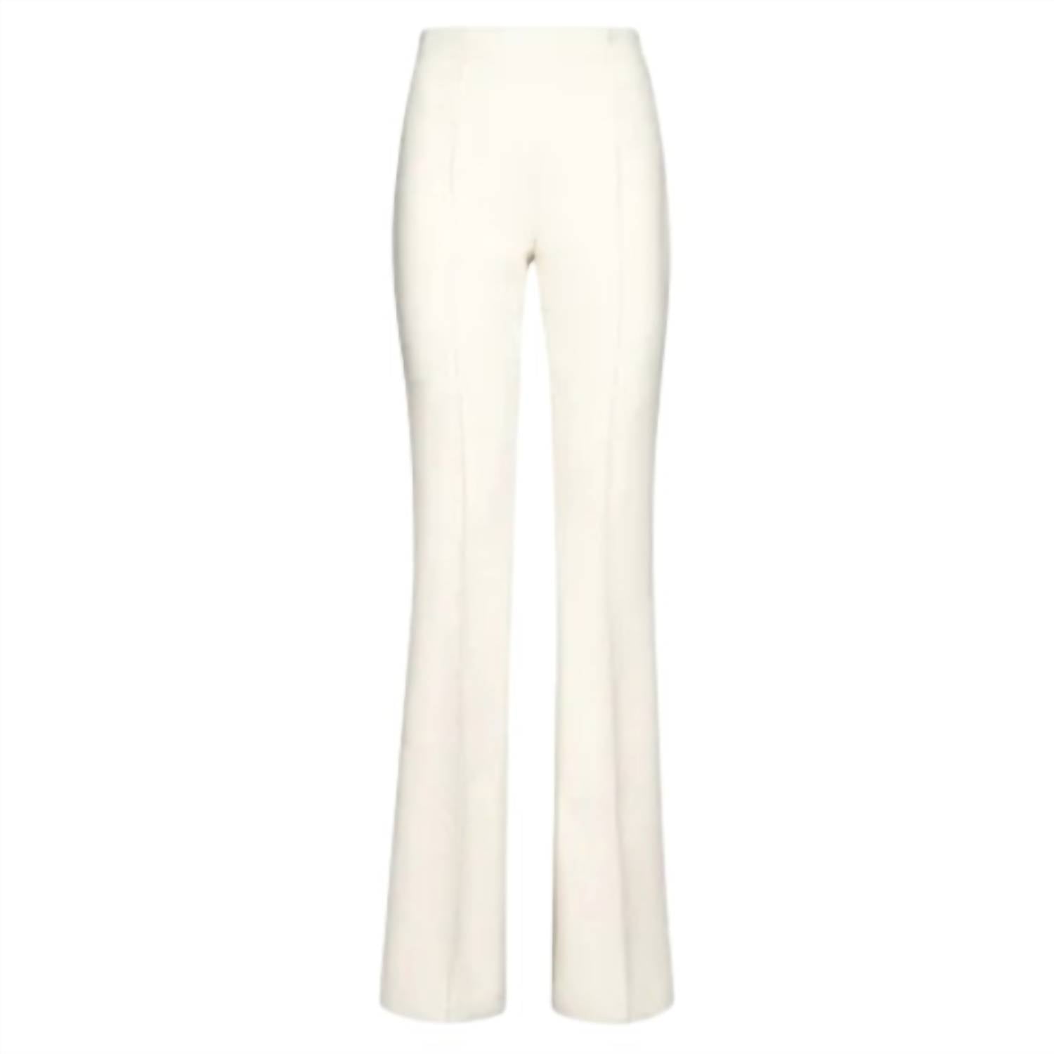 Elevate your wardrobe with the Women's Flared Trouser Pants by Salvatore Ferragamo, crafted for sophistication in elegant Parchment. These trousers boast a high-rise waist and a flared leg design that flatters and elongates the silhouette. Made from a soft, stretchy fabric with ribbed stitching, they promise all-day comfort and a stylish, minimalist look. Ideal for various occasions, they can be styled effortlessly with a sweater, silk shirt, or matching jacket. Model size: 5'11".