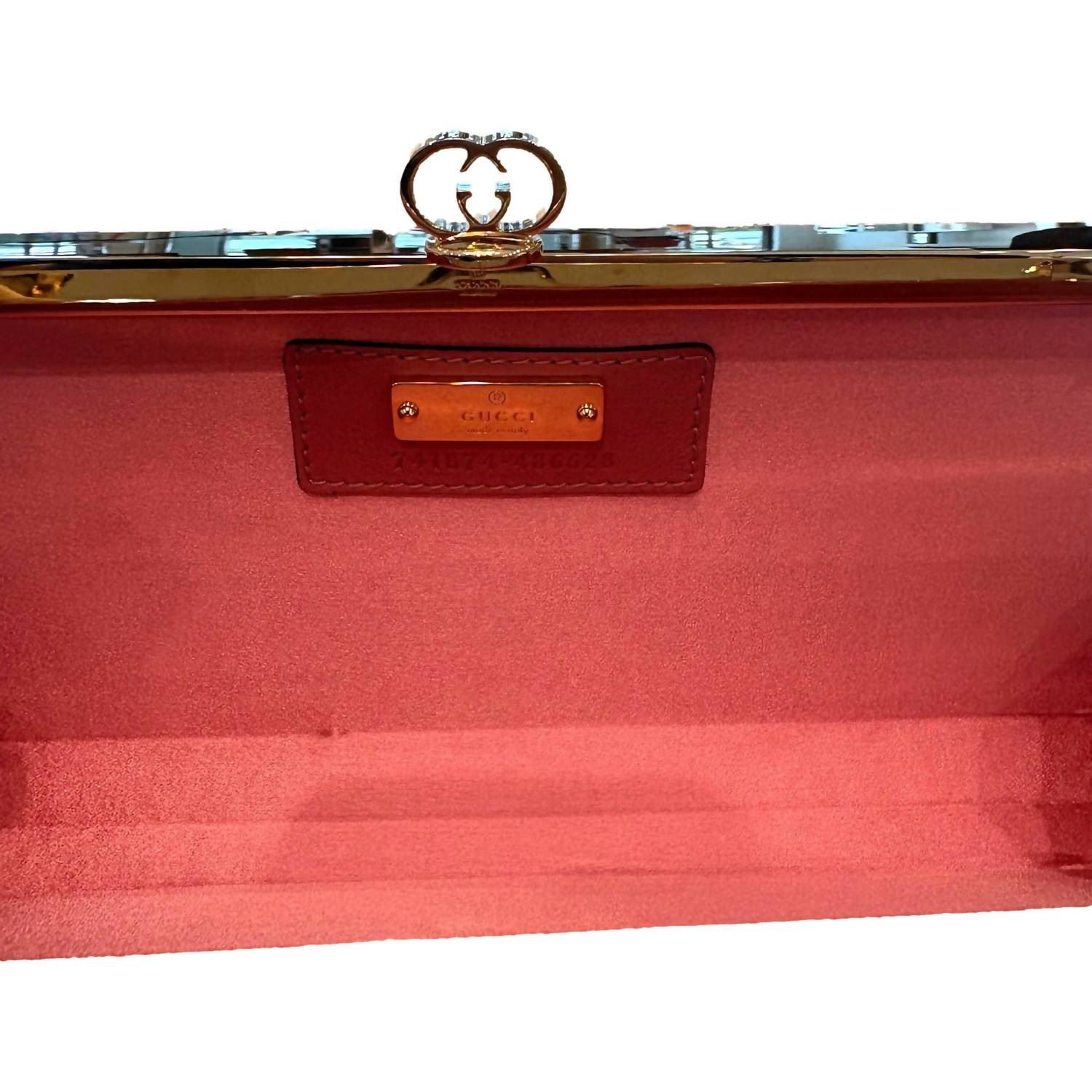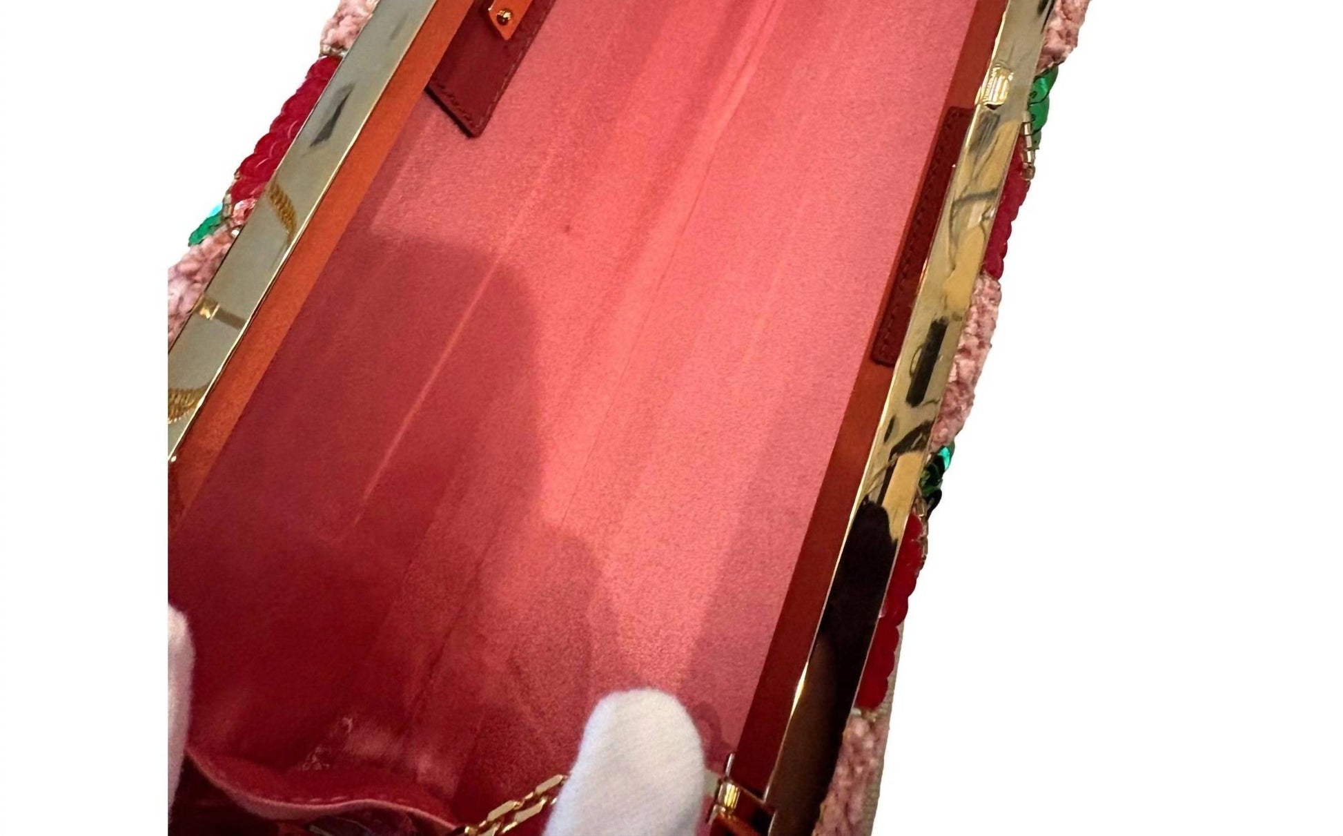 The Gucci Broadway Embellished Sequins Chain Shoulder Bag is a luxurious creation made in Italy, perfect for adding glamour to any outfit. This bag features a dazzling blend of red, green, and pink sequins with a subtle Gucci logo and gold tone hardware. It can be worn as a shoulder bag with its 19" thin gold tone chain strap or as a clutch for more elegant occasions. Boasting a pink satin interior and a spacious main compartment, this bag measures 11.5" x 1.5" x 4" and includes a Gucci dust bag, box, and authenticity cards.