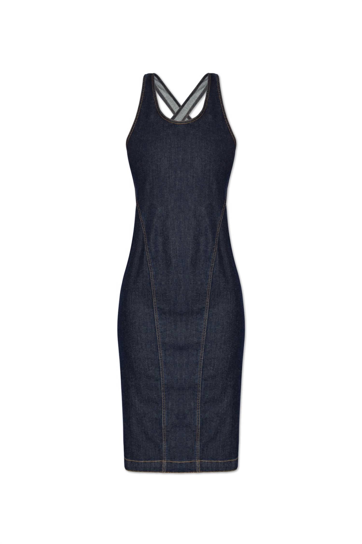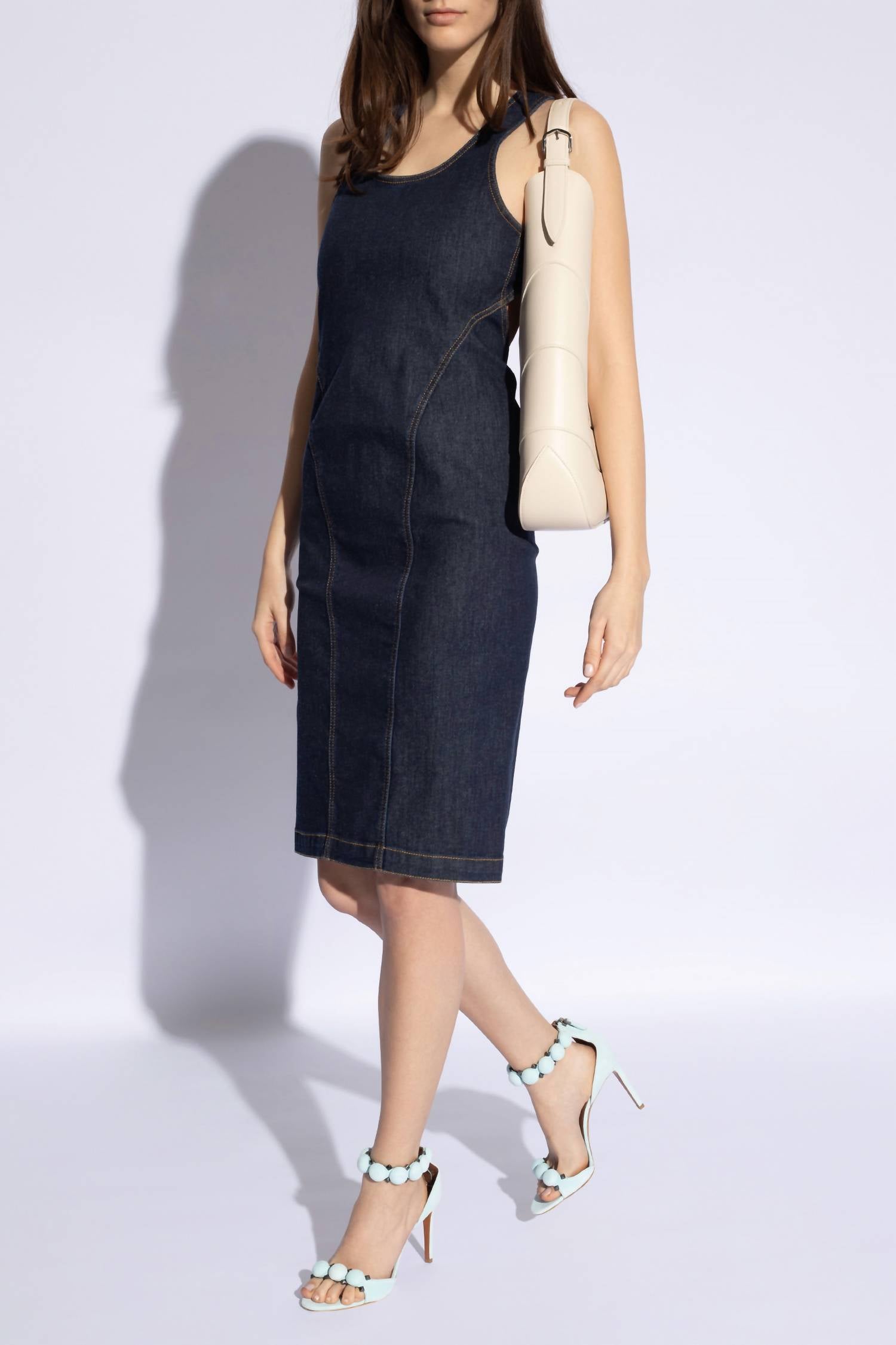 A midi dress so versatile, your options for wearing it are endless. Introducing the Sculpt Dress by Alaia, a striking bodycon design crafted for the modern woman. In a sophisticated blue denim, this sleeveless dress features crossed straps at the back and a flattering scoop neckline, falling to a chic midi length. Made in Italy from stretch brut denim, its composition is 90% cotton, 8% polyester, and 2% elastane, ensuring a comfortable fit. Closure: Zip closure. Care: Dry clean only.
