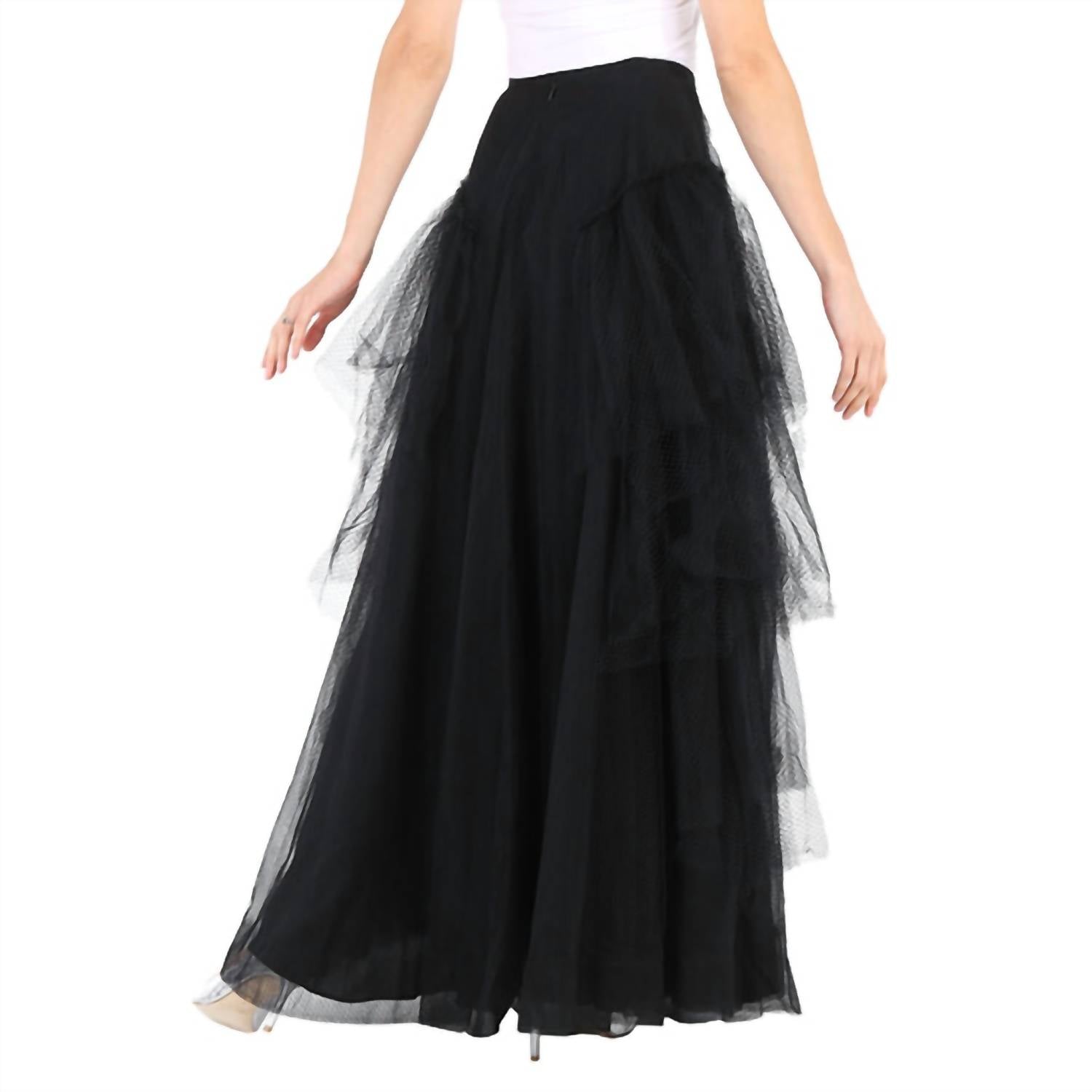 Flowy, comortable and stylish. This maxi skirt is a fan favorite. This tiered evening skirt is crafted from a delicate open-net tulle design, offering an elegant and airy look. Made from a blend of 100% silk and polyamide, it combines luxurious texture with fluid movement, making it perfect for formal occasions.