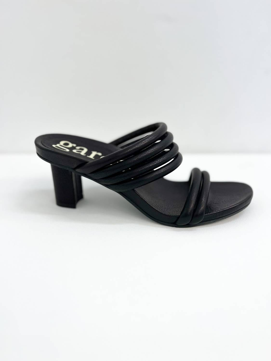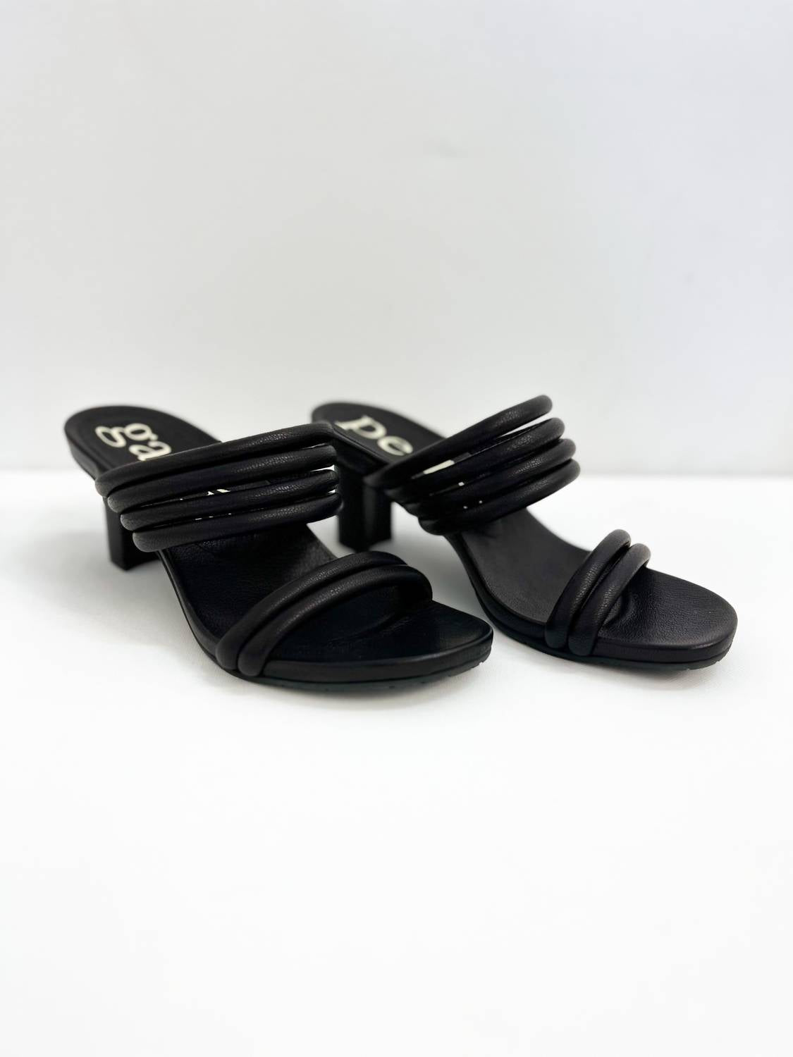 Midi mule heels. Tubular straps. Spanish pebbled leather. TPU sole. Gold embossing. Chrome free Leather. Anatomical Rubber. Cork Insole. Made in Spain.