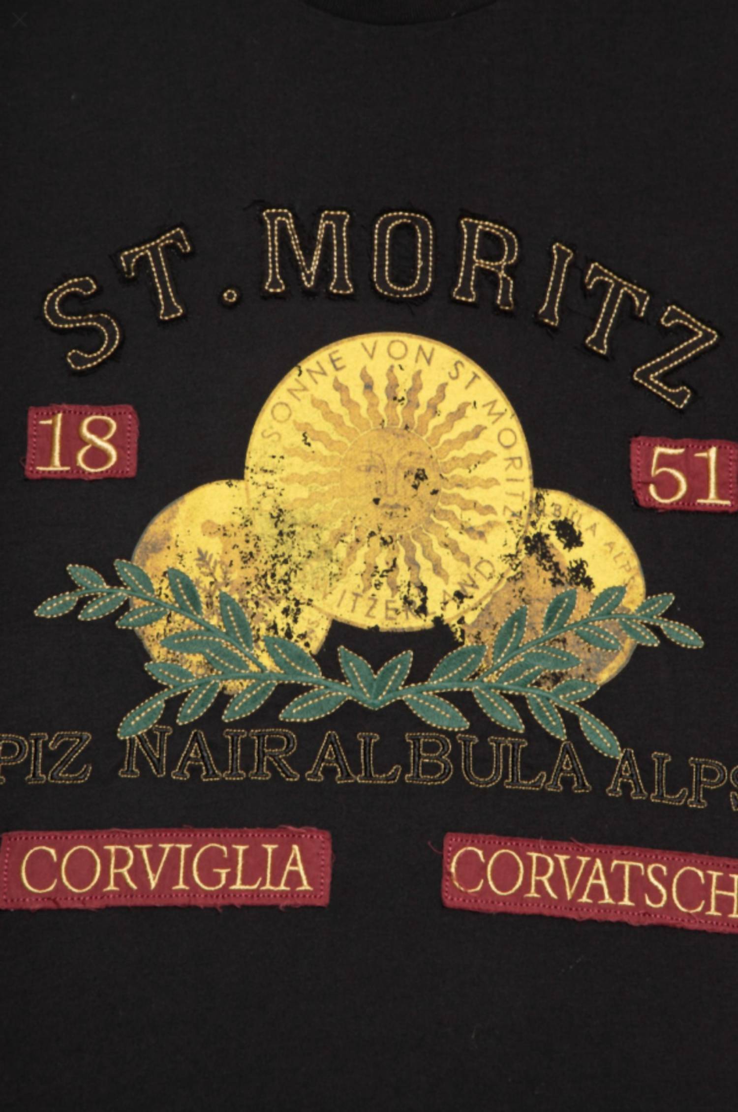 Discover the Bally Men's St. Moritz Graphic T-shirt, a standout from the iconic St. Moritz jersey line. This short sleeve tee, crafted from 100% cotton, showcases a relaxed fit adorned with intricate front graphics and fancy embroideries. It includes a unique leather-detailed logo patch, adding a sophisticated touch. Made in Portugal, this pullover style ensures comfort and timeless style, perfect for elevating any casual ensemble.