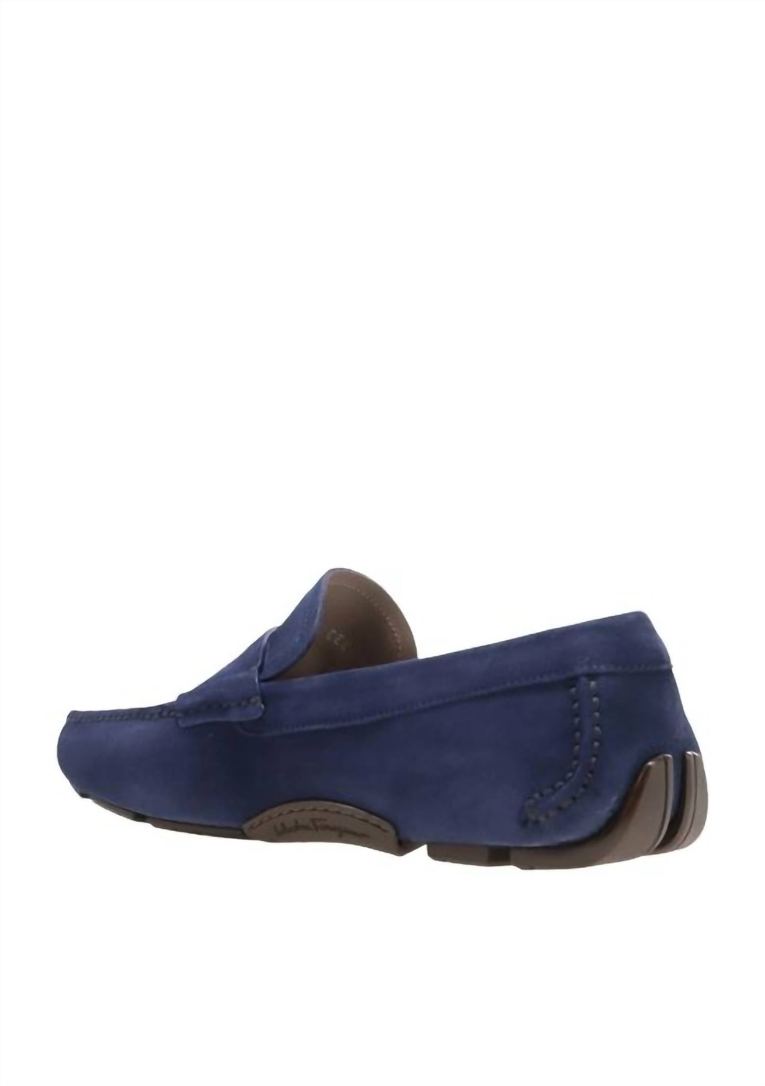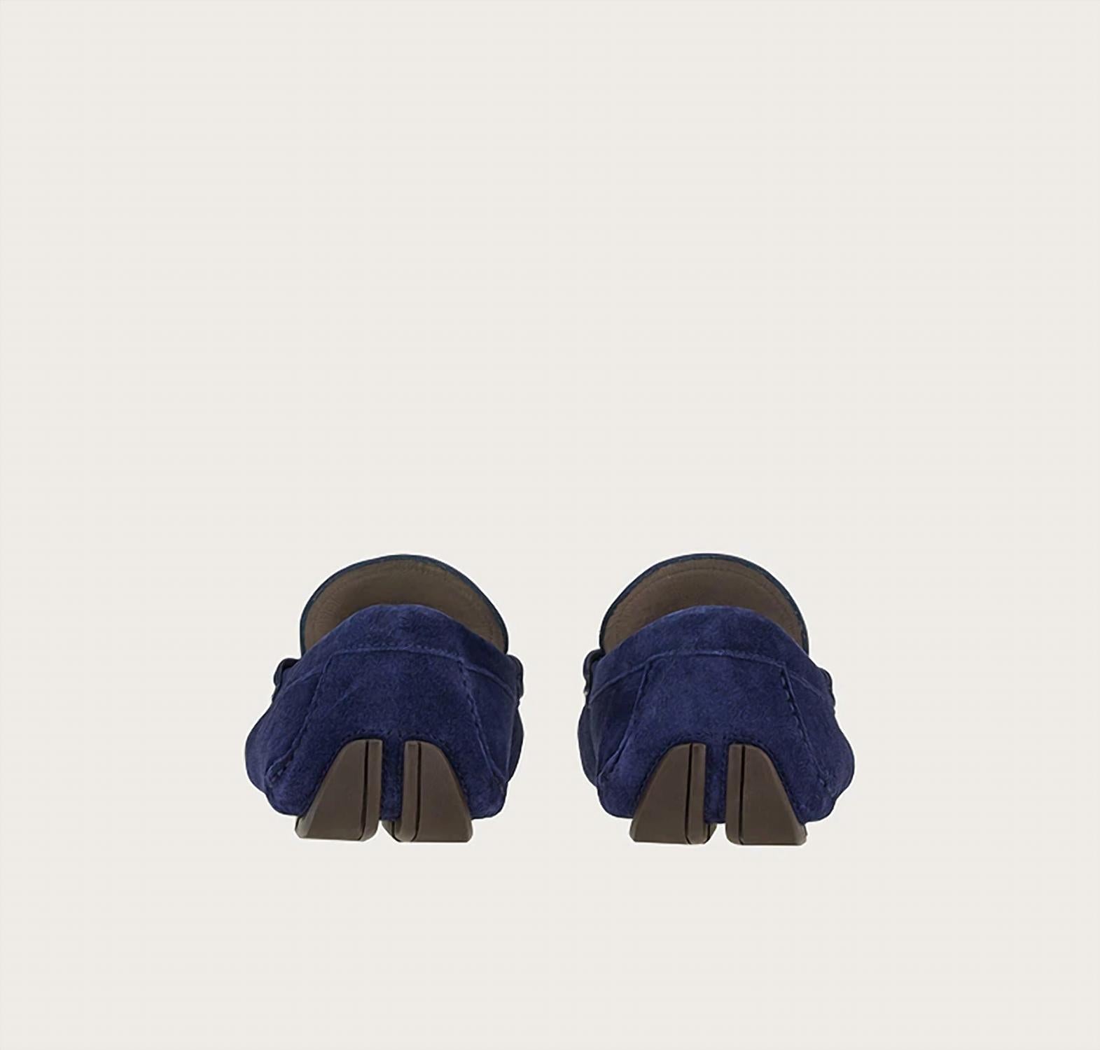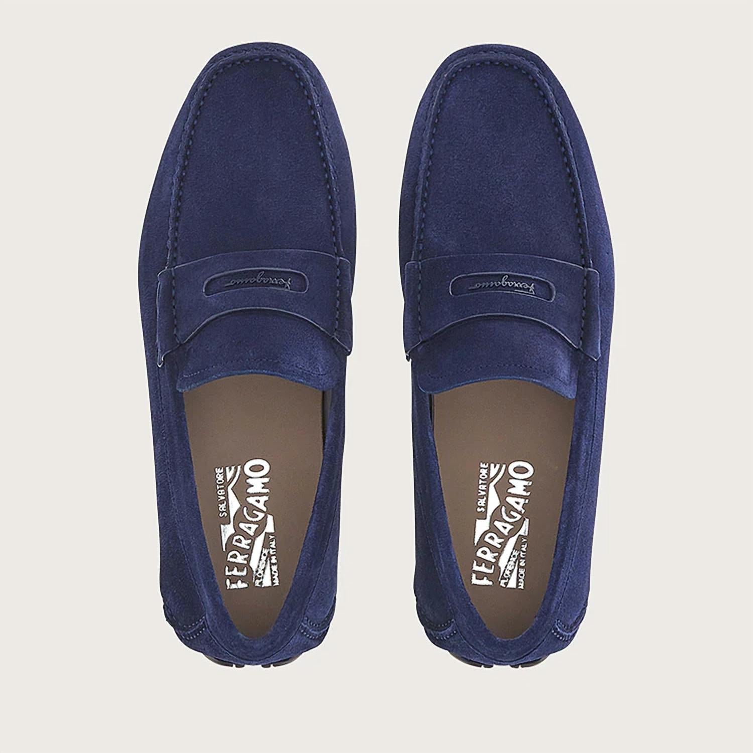 The Salvatore Ferragamo Men's Driver Signature Loafer is a sophisticated choice for the minimalist wardrobe. Expertly crafted from premium suede, this blue loafer features a stylish round toe and flat heel, making it ideal for spring dinner parties or New Year's Eve gatherings. Designed for modern adult men, this timeless shoe provides effortless elegance and comfort. With its sleek silhouette, it aligns perfectly with a minimalist trend.