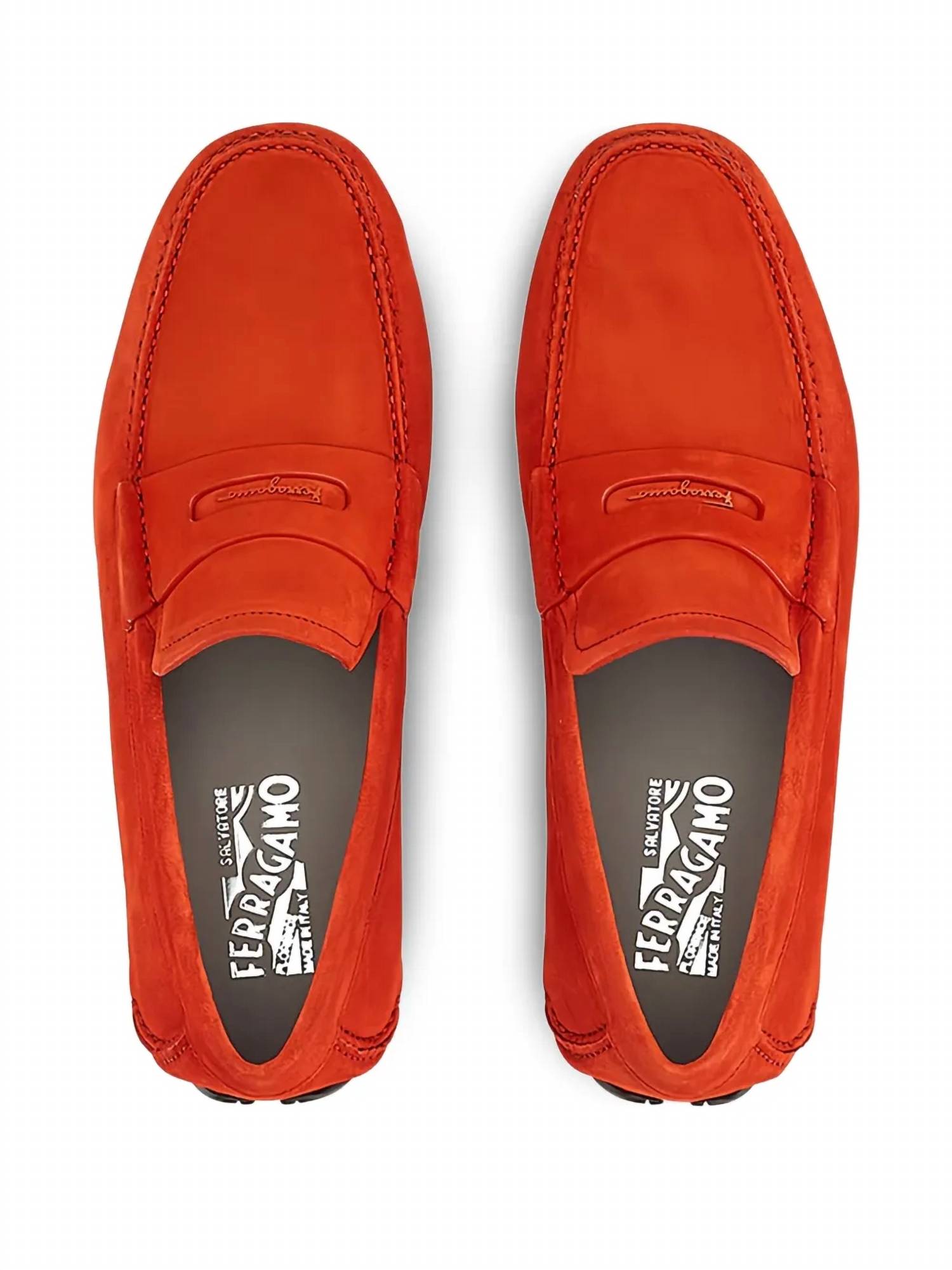 Introducing the Men's Suede Leather Loafers by Salvatore Ferragamo, perfect for adding a touch of elegance to your holiday party ensemble. These slip-on loafers in a striking red feature a luxe suede leather upper, rounded toe, and a branded insole for comfort and style. Crafted in Italy, they boast a flat sole made entirely of durable rubber, with a lining and outer of 100% calf leather. Ideal for the minimalist seeking sophistication, these shoes are a perfect fit for spring festivities like Chinese New Year.
