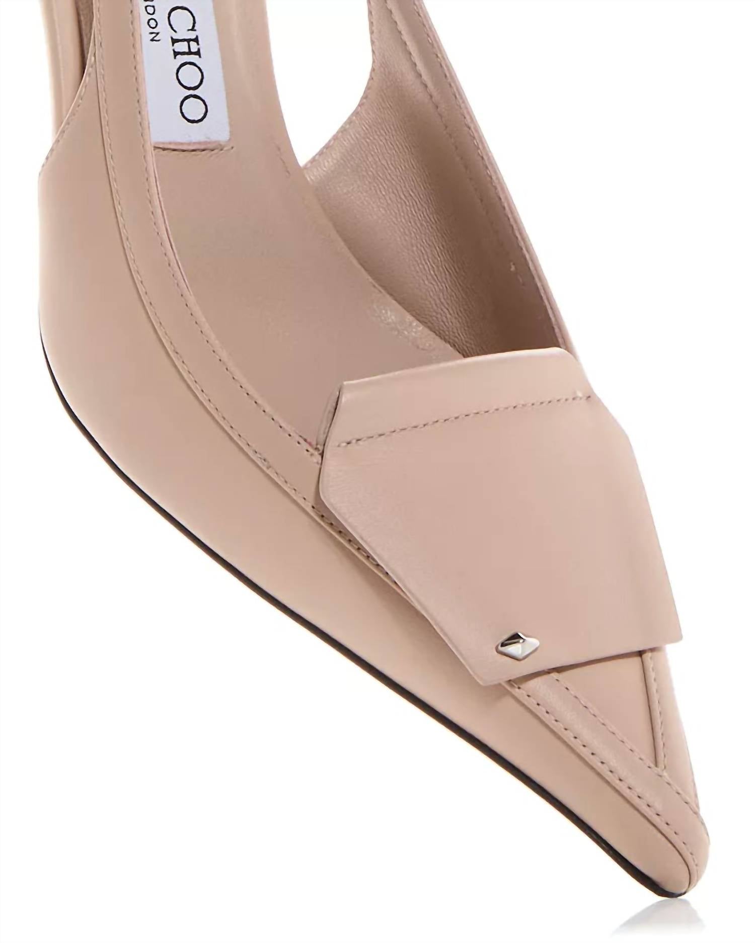 This sandal will take you from brunch to dinner and everything in between. Elevate your spring workwear wardrobe with the Women's Fold Leather Slingback Sandals by JIMMY CHOO, offered in a sophisticated nude shade. These Italian-sized sandals boast a pointed toe and a chic fold leather detail with studs for added elegance. Crafted with a leather upper, lining, and sole, they feature a stiletto heel with a comfortable 60mm (2.3") height, perfectly suited for holiday parties and Easter occasions. With a slingback self-buckle strap closure, these sandals ensure a secure fit and timeless style.