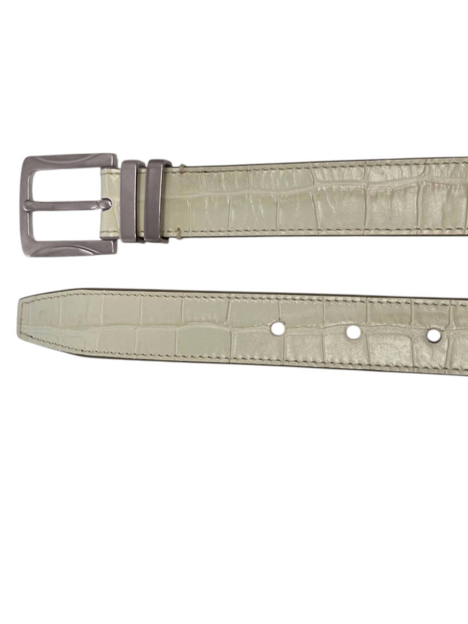 The perfect belt can really tie an outfit together and this one is no exception. Classic in its design and built to last, this belt can complement any outfit. Elevate your ensemble with the Women's Curved Croc Leather Belt by BALLY, a testament to timeless elegance and Italian craftsmanship. This belt, in a sophisticated bone hue, is crafted from luxurious bovine leather for a soft, refined feel and features hammered silver hardware that adds a touch of class. Designed to fit waist sizes up to 120 cm (47 inches), its fixed style ensures a sleek, secure fit for most body types. A versatile accessory, it seamlessly complements both casual and formal wear, making it an essential addition to your wardrobe. Size: EU 120/US 47.