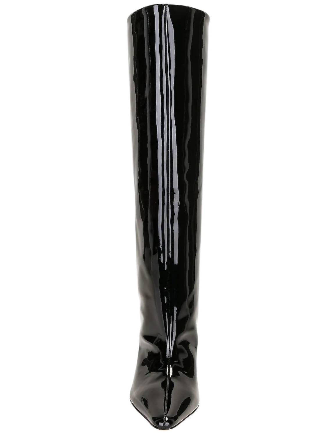 A trend that is here to stay. Step into timeless elegance with the BALLY Women's Kika Patent Leather Knee High Boots, showcasing expert Italian craftsmanship. These sleek black boots feature a high-gloss patent leather upper and a durable leather sole, enhancing both luxury and durability. Designed with a pointed toe and contrast cone heel, they offer a modern twist on a classic silhouette, further elevated by a chic 3.5-inch heel height. The easy pull-on style and a shaft height of 15.25 inches ensure a bold knee-high profile with a close fit. Made in Italy, these boots promise unmatched quality and style.