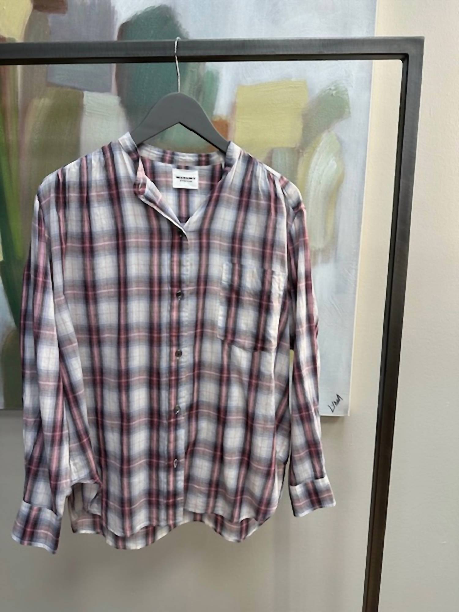 Checkered cotton voile blouse with buttoned front, chest patch pocket and gathered shoulders.