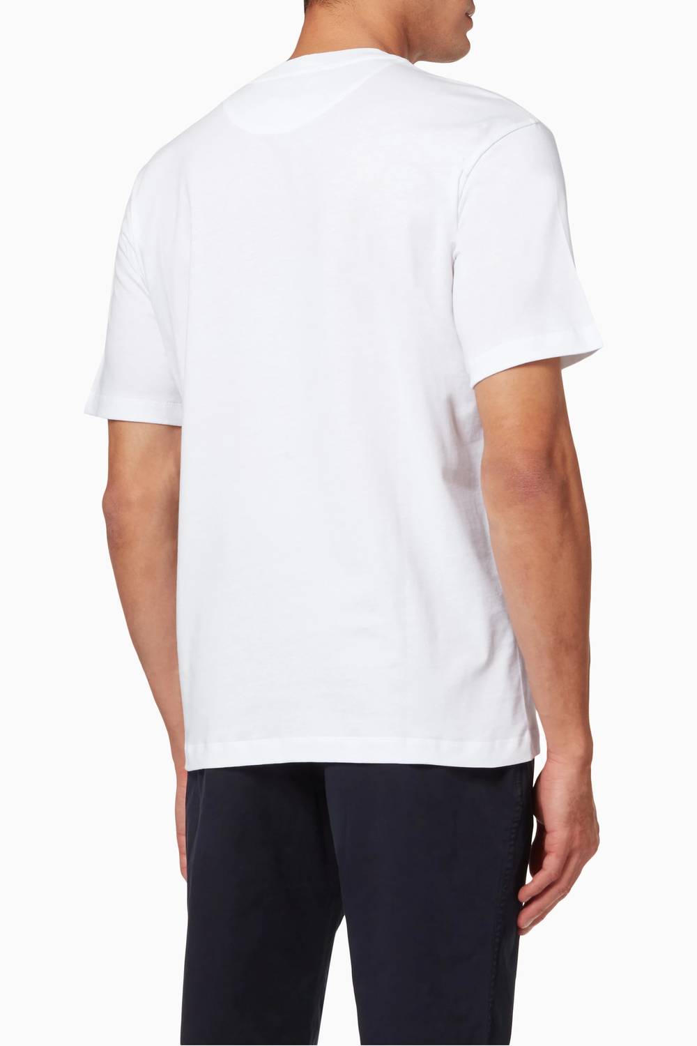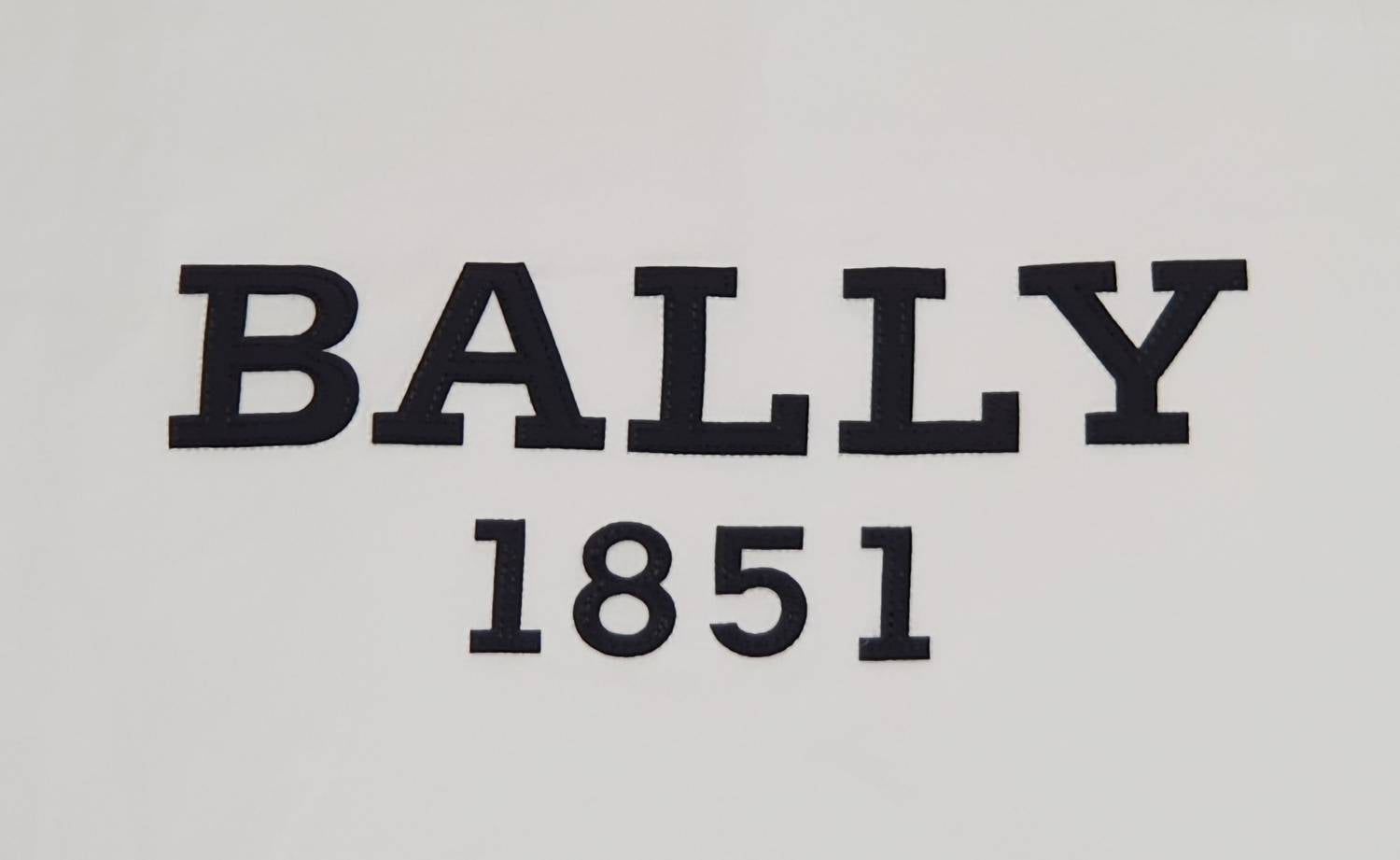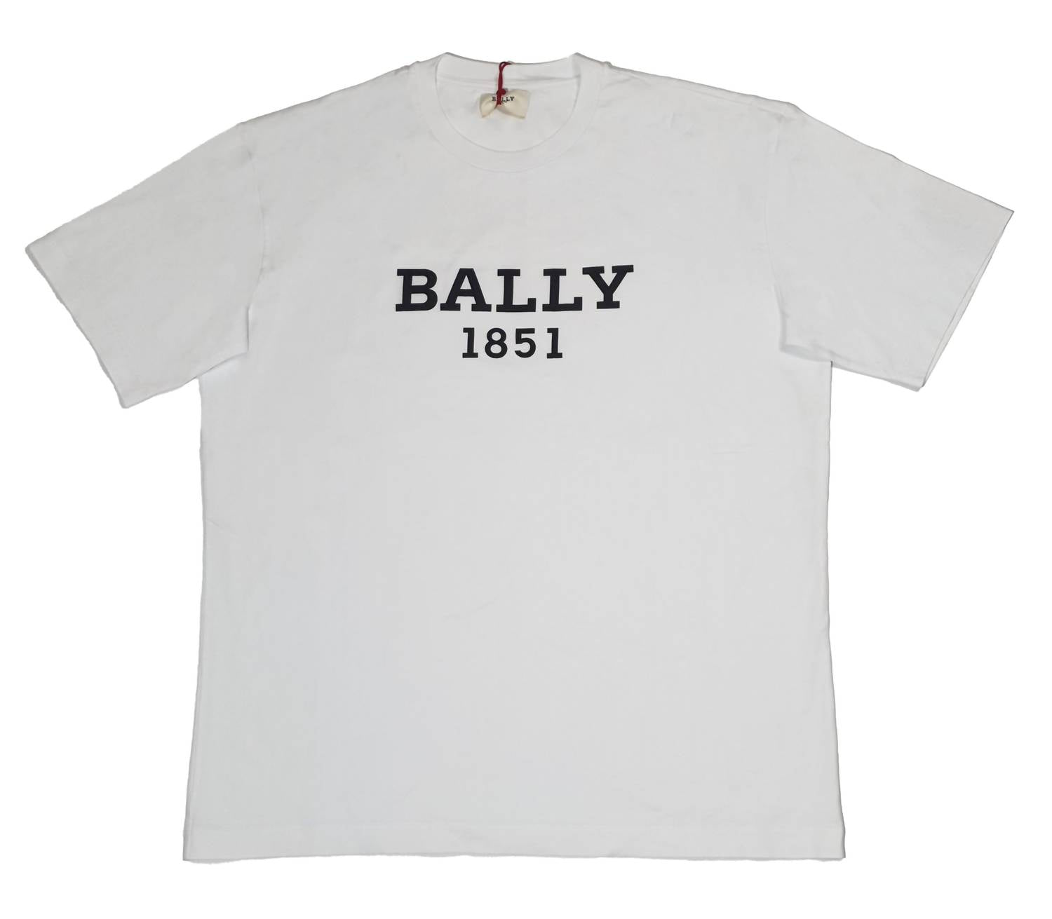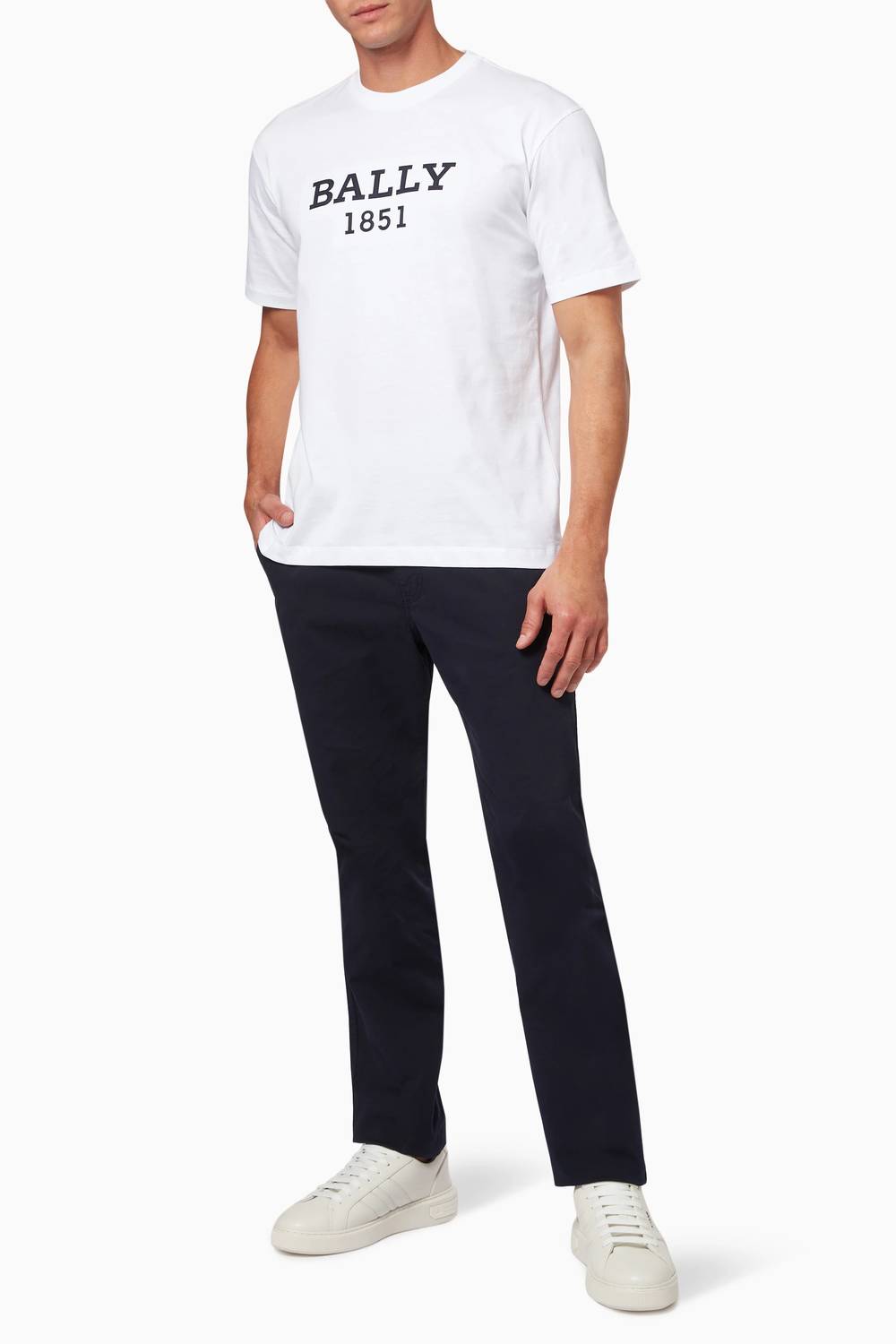 Discover the Men's Graphic Logo T-shirt by Bally, featuring short sleeves and crafted from a luxurious blend of 100% organic cotton and polyester. This t-shirt, made in Portugal, showcases a striking black embroidered Bally 1851 logo on a pristine white background. Closure: Pull-on style for easy wear. Care: Machine wash to maintain its crisp look.
