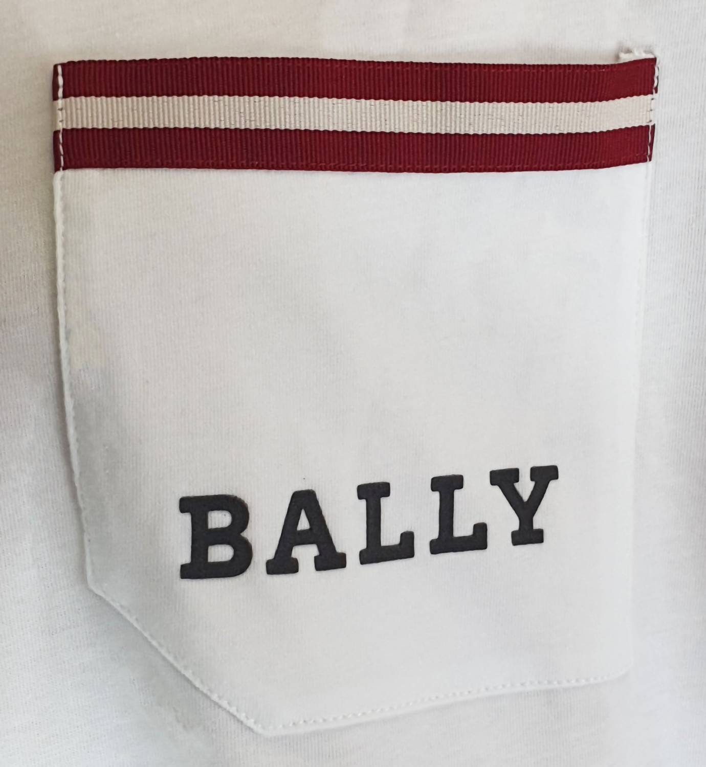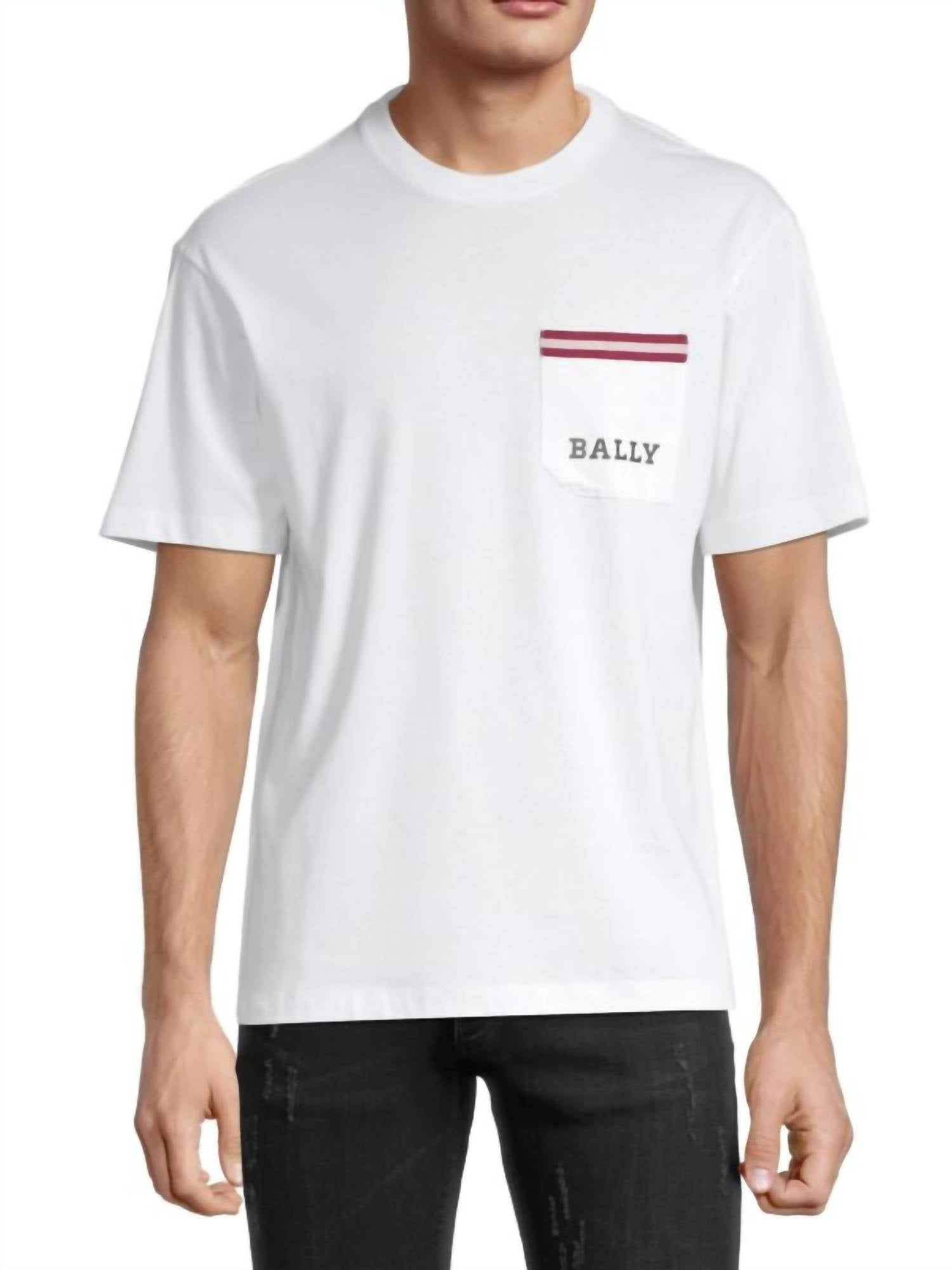 Introducing the Men's Short Sleeve Pocket T-shirt by BALLY, an embodiment of elegance and comfort. Crafted from 100% cotton, this bone-colored tee offers softness for all-day wear, complemented by a stylish graphic pattern. It features a single chest pocket accented with Bally's iconic stripe and logo, ensuring both practicality and brand distinction. Made in Bulgaria, this pull-on t-shirt is designed with a crewneck for a classic look.
