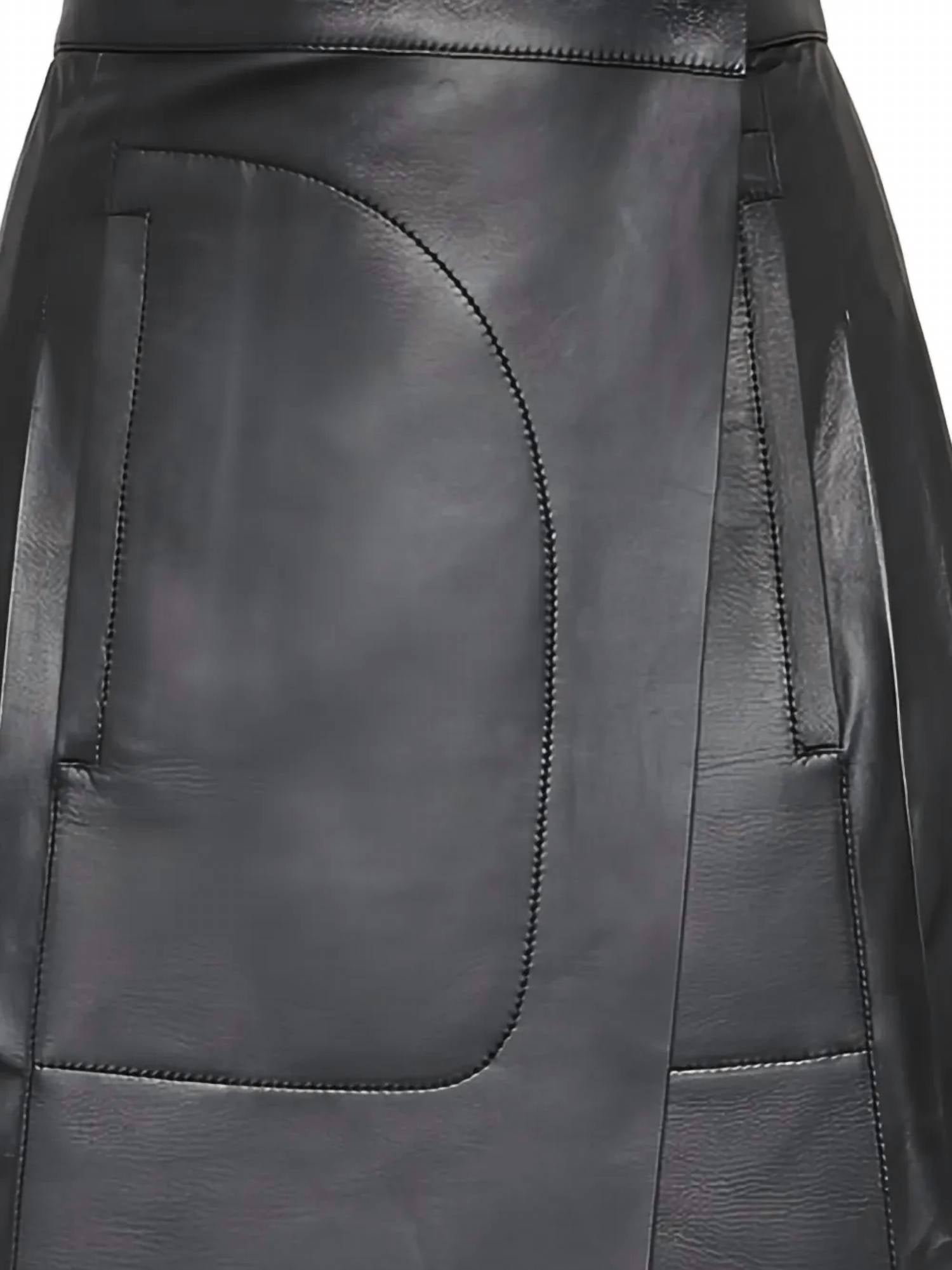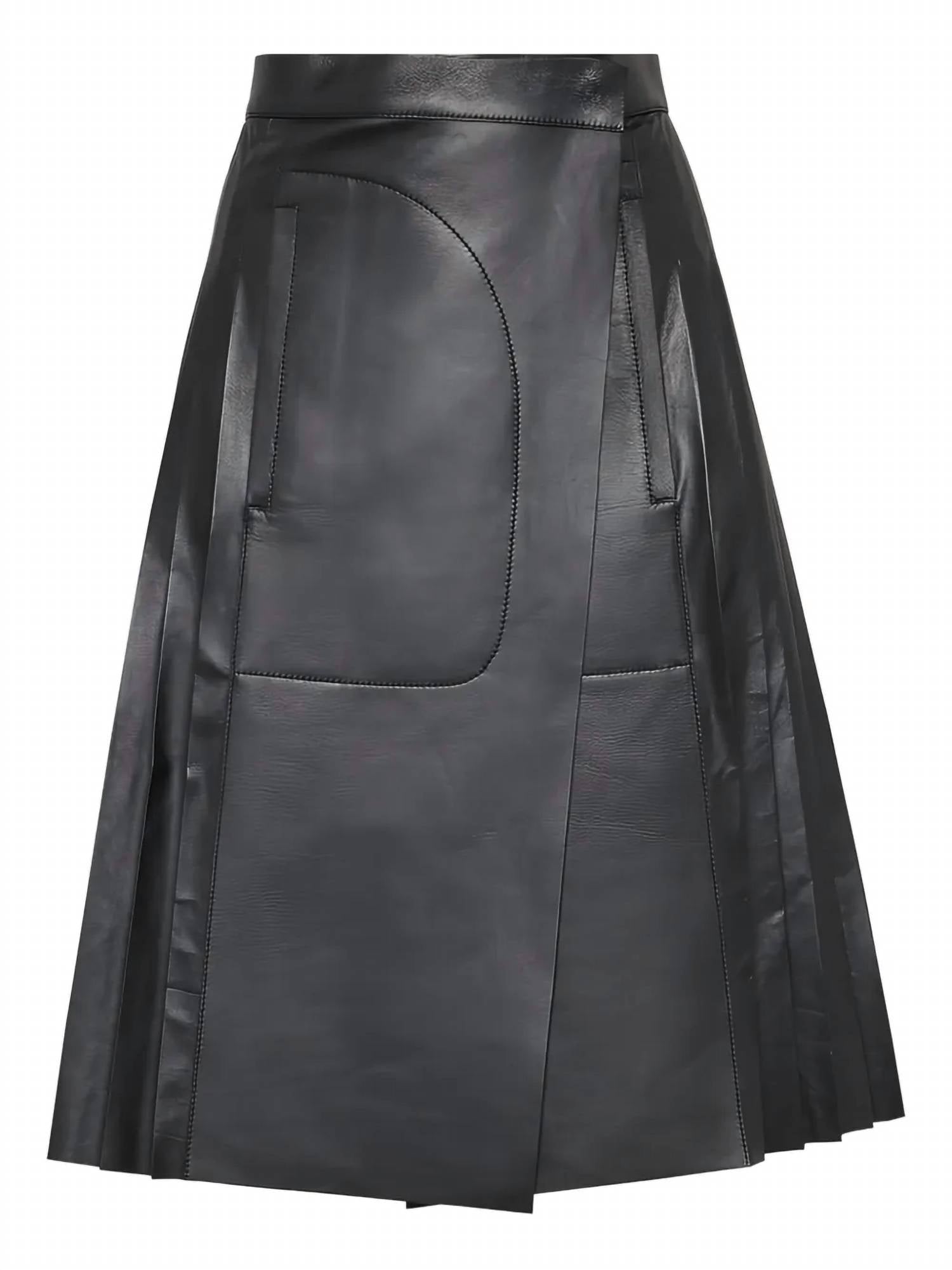 Tuck your favorite tee into this midi length skirt for an effortlessly cool look. Discover the Women's Pleated Leather Midi Skirt by Salvatore Ferragamo, a statement piece perfect for a dinner party or New Year’s Eve. Made in Italy, this elegant black skirt highlights luxurious 100% leather construction with intricate pleat detailing and a chic wrap design. The garment features an asymmetric hem that exudes sophistication and trend-forward quiet luxury. This skirt not only elevates any fall wardrobe but also adds a touch of modern elegance to your look.