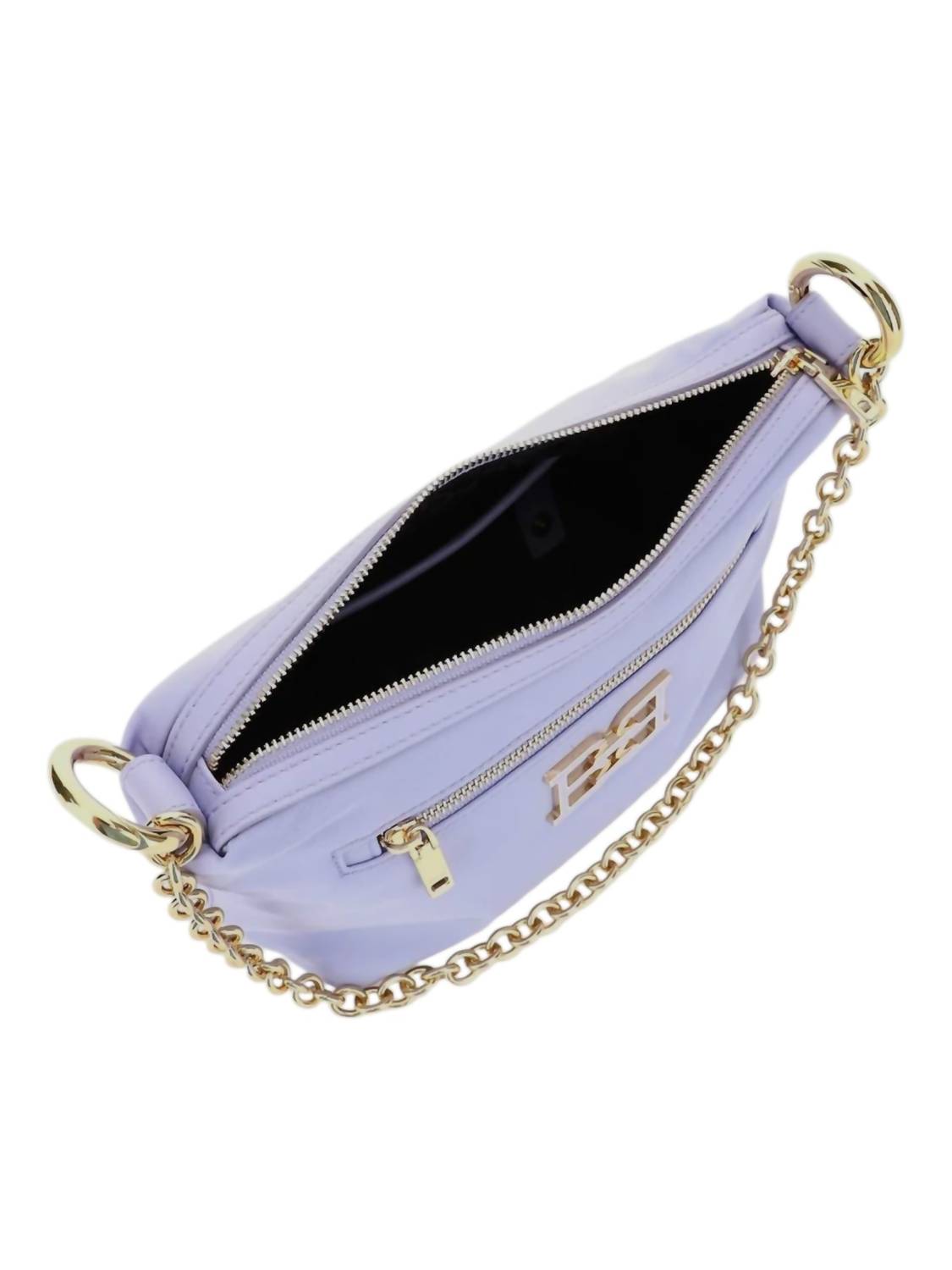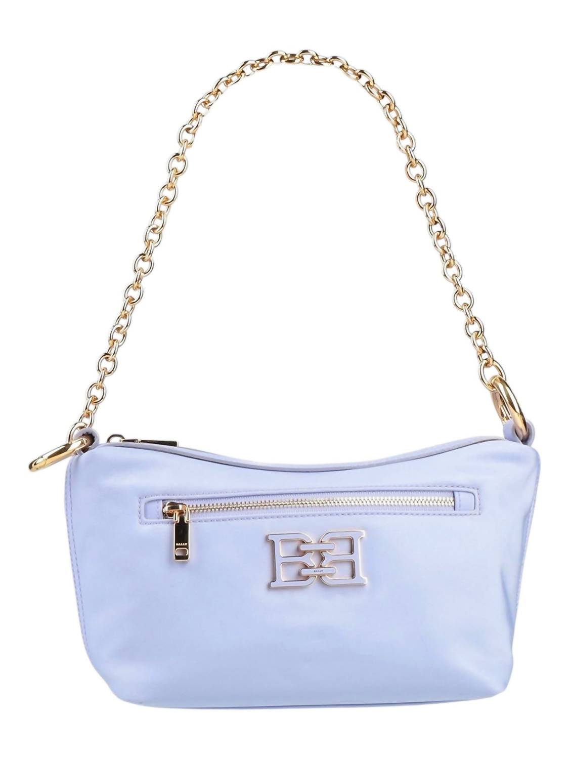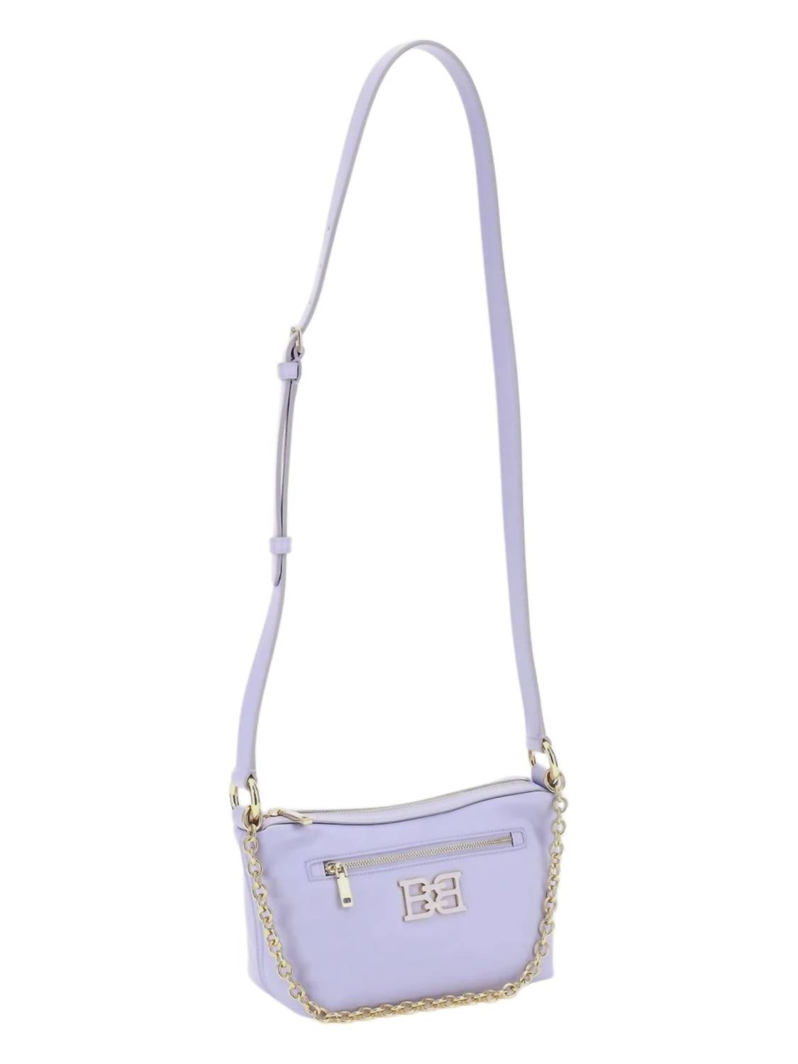 This crossbody bag will be your go-to bag of the season. Introducing the Bally Eyfel Women's Logo-Plaque Crossbody Bag, an elegant accessory crafted from 100% nylon in a chic lavender hue. Measuring 7.5 inches in width, 6 inches in height, and 4 inches in depth, this bag is designed for both style and practicality. It features a luxurious front chain logo plaque, adding sophistication to its minimalist design. Perfectly compact for daily use, this crossbody bag seamlessly complements any outfit.